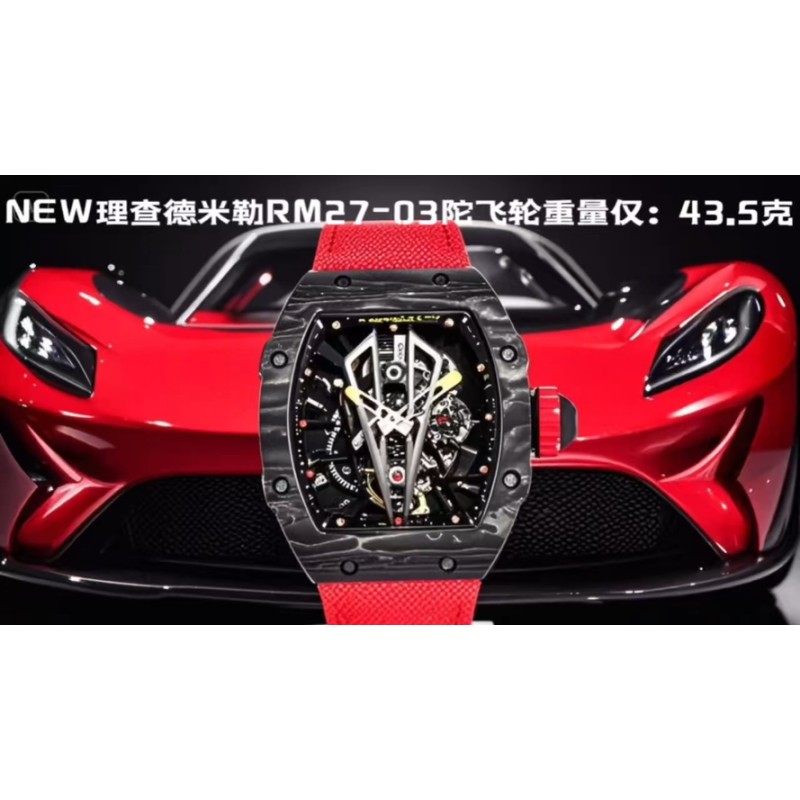 『NEW Factory』重磅新推.轻量级之王:理查德米勒MR27-03陀飞轮腕表 重金打造RM27-03陀飞轮机芯,机芯融合NTPT碳纤维表壳!创造出业界内最轻陀飞轮腕表。 请认准NEW工厂、全表仅43.5克。唯一所有细节对原版。 西班牙公牛--RM27-03超轻运动陀飞轮腕表。 机芯盘面采用(Spanish Matador)“公牛”设计理念,镂空桥板造型的一只霸气的公牛牛头,“牛头”下方是清晰可见的发条盒、机械齿轮和陀飞轮擒纵机构, 表壳采用薄层复合工艺TPT石英碳纤维打造、五级钛合金螺丝、9级硬度蓝宝石镜面,橡胶编织魔术贴表带,“全表仅43.5克” 坚硬与轻量之间的碰撞 让人联想起当年 拉菲尔纳达尔 在球场上永不言弃、奋力拼搏的英姿。 『新厂-NEW Factory』实现新突破,用“心”对待腕表爱好者!