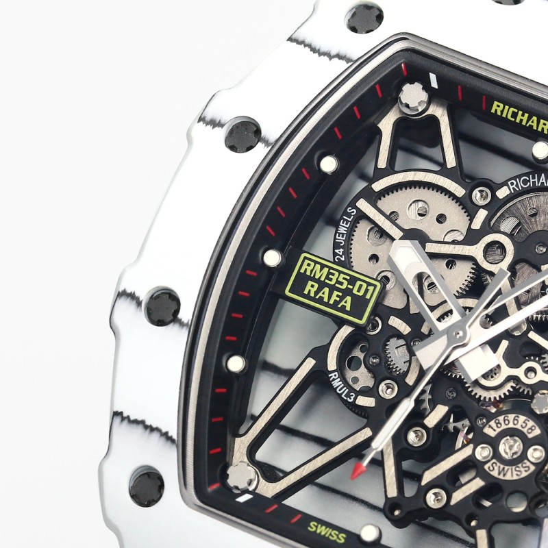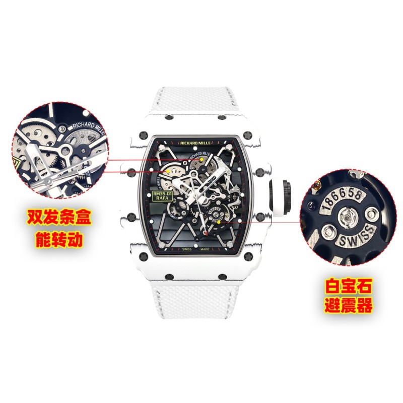 『新厂-NEW Factory』【天花板】RICHARD MILLE理查德米勒RM 35-01 RAFAEL NADAL碳纤维腕表——作为亿万富豪的入场劵 1机芯:目前市场最高版本机芯,独家研发原装RMUL3镂空一体机芯、白宝石避震器、经过长期测试,稳定性相当高,机芯打磨到位,(原装同步) 2表壳:进口NTPT 原装纹路碳纤维打造、轻量 级表款,克重仅 50g、内胆与表盖钢件采用钛 合金材料、CNC 高精密加工、使表壳配合完美 无缝隙!真正做到原装正品细节。 3表盘:镂空表盘搭配经典黑红赛道内影展现腕 表独有魅力 4:表镜:采用高弧度蓝宝石镜面双,并采用双面电镀高透膜,具有防眩效果,清晰而精致。 5:表带:天然橡胶表带与编制魔术贴表带选 择、 6:表扣:钛合金折叠表扣,原装开模,刻字清晰立体,完美还原正品形状,弹簧片同样采用钛金属,弹性效果更好更持久 7:螺丝:全部采用钛金属电镀深灰色工艺,同步原装效果 『新厂-NEW Factory』实现新突破,用“心”对待腕表爱好者!