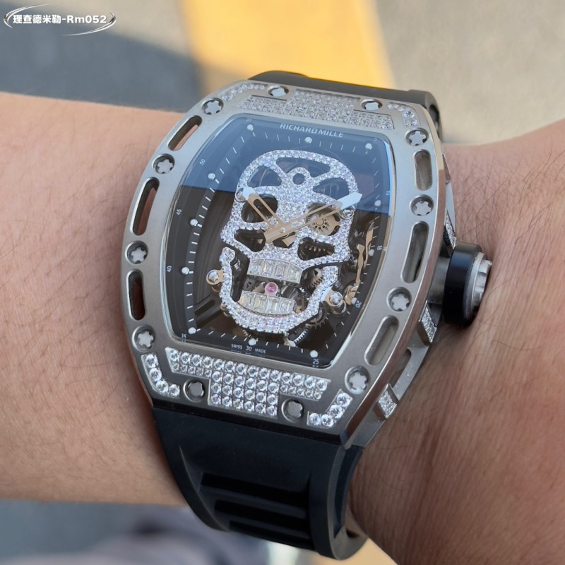 理查德米勒-真陀飞轮! Rm052"至尊鬼王"震撼上市,1,根据百万级正品理查德米勒为基础,按瑞士标准订制的EUR陀飞轮机芯。市场第一款瑞士标准订制的陀飞轮机芯,还原度最高的理查德米勒。2,深度研究原厂RM052的表壳材质,采用航空钛金属重量比普通钛壳表轻30%。表壳锁毕结构高度还原正品水准,3,顶级印尼进口橡胶表带,根据真正的理查德米勒表带设计!!!