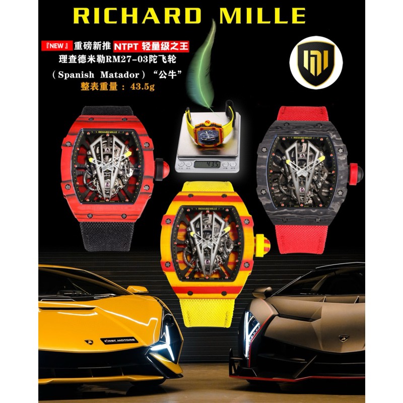 『NEW Factory』重磅新推.轻量级之王:理查德米勒MR27-03陀飞轮腕表 重金打造RM27-03陀飞轮机芯,机芯融合NTPT碳纤维表壳!创造出业界内最轻陀飞轮腕表。 请认准NEW工厂、全表仅43.5克。唯一所有细节对原版。 西班牙公牛--RM27-03超轻运动陀飞轮腕表。 机芯盘面采用(Spanish Matador)“公牛”设计理念,镂空桥板造型的一只霸气的公牛牛头,“牛头”下方是清晰可见的发条盒、机械齿轮和陀飞轮擒纵机构, 表壳采用薄层复合工艺TPT石英碳纤维打造、五级钛合金螺丝、9级硬度蓝宝石镜面,橡胶编织魔术贴表带,“全表仅43.5克” 坚硬与轻量之间的碰撞 让人联想起当年 拉菲尔纳达尔 在球场上永不言弃、奋力拼搏的英姿。 『新厂-NEW Factory』实现新突破,用“心”对待腕表爱好者!