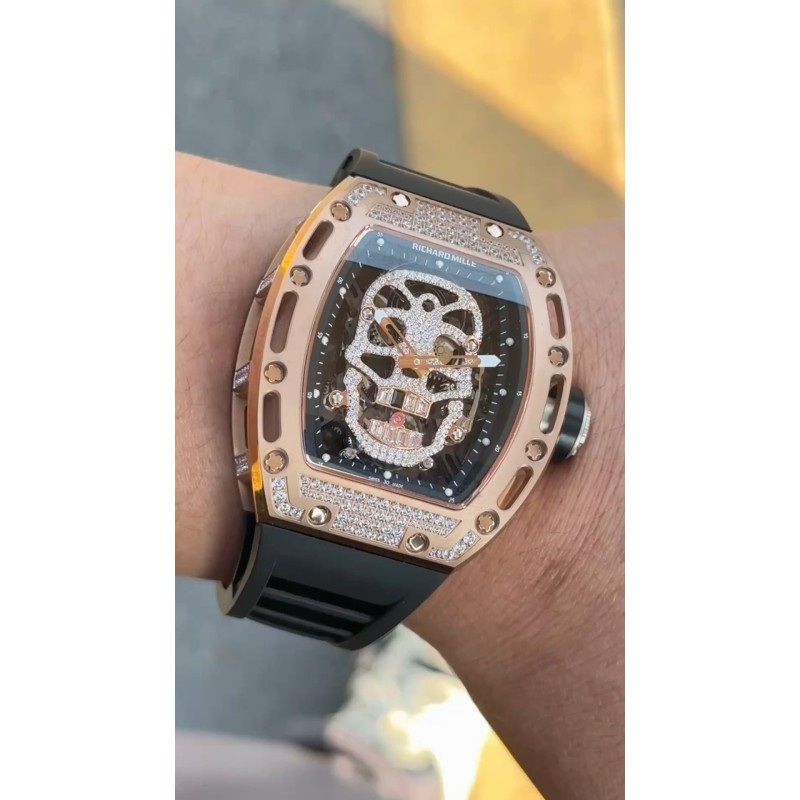 理查德米勒-真陀飞轮! Rm052"至尊鬼王"震撼上市,1,根据百万级正品理查德米勒为基础,按瑞士标准订制的EUR陀飞轮机芯。市场第一款瑞士标准订制的陀飞轮机芯,还原度最高的理查德米勒。2,深度研究原厂RM052的表壳材质,采用航空钛金属重量比普通钛壳表轻30%。表壳锁毕结构高度还原正品水准,3,顶级印尼进口橡胶表带,根据真正的理查德米勒表带设计!!!