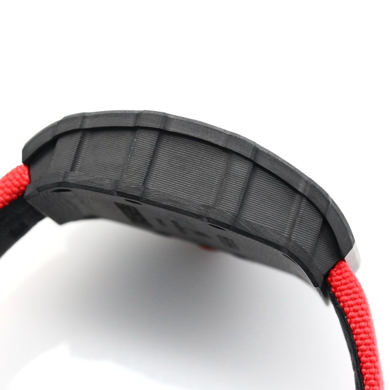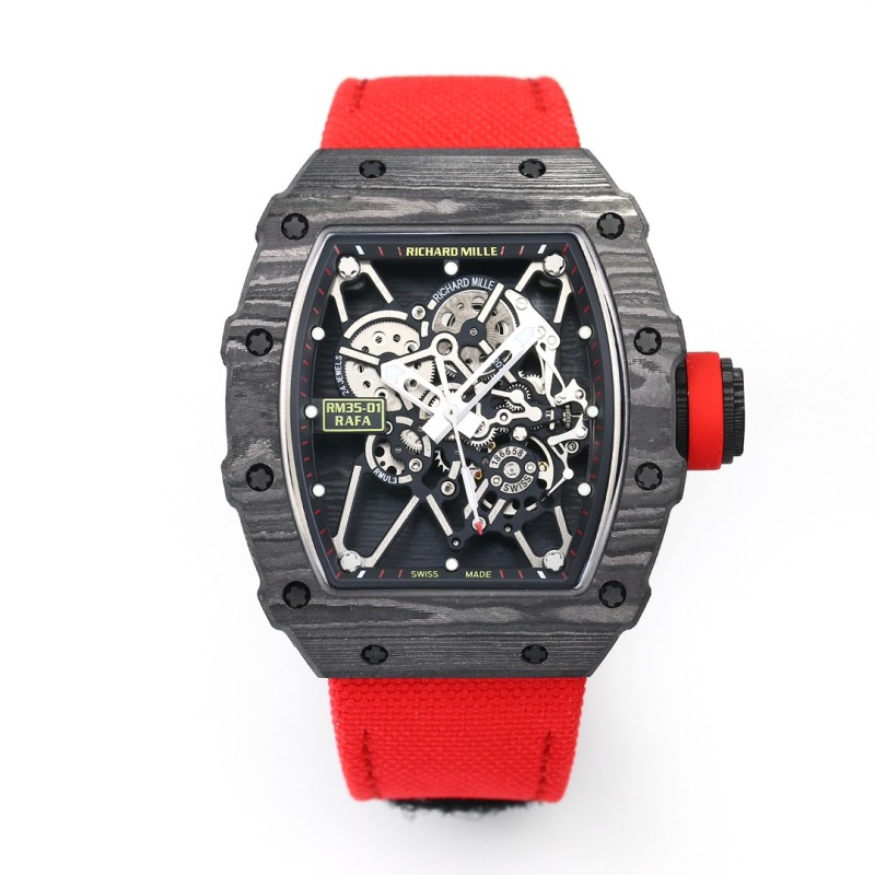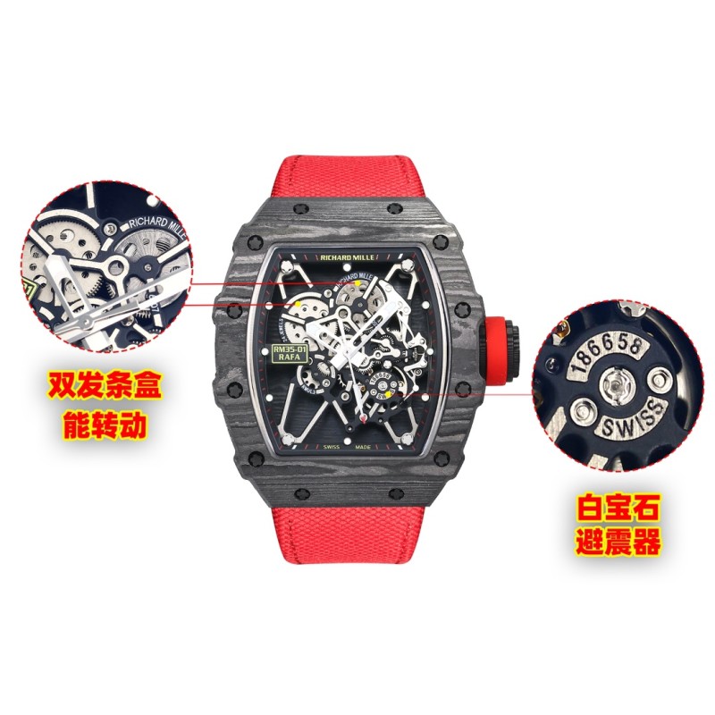 『新厂-NEW Factory』【天花板】RICHARD MILLE理查德米勒RM 35-01 RAFAEL NADAL碳纤维腕表——作为亿万富豪的入场劵 1机芯:目前市场最高版本机芯,独家研发原装RMUL3镂空一体机芯、白宝石避震器、经过长期测试,稳定性相当高,机芯打磨到位,(原装同步) 2表壳:进口NTPT 原装纹路碳纤维打造、轻量 级表款,克重仅 50g、内胆与表盖钢件采用钛 合金材料、CNC 高精密加工、使表壳配合完美 无缝隙!真正做到原装正品细节。 3表盘:镂空表盘搭配经典黑红赛道内影展现腕 表独有魅力 4:表镜:采用高弧度蓝宝石镜面双,并采用双面电镀高透膜,具有防眩效果,清晰而精致。 5:表带:天然橡胶表带与编制魔术贴表带选 择、 6:表扣:钛合金折叠表扣,原装开模,刻字清晰立体,完美还原正品形状,弹簧片同样采用钛金属,弹性效果更好更持久 7:螺丝:全部采用钛金属电镀深灰色工艺,同步原装效果 『新厂-NEW Factory』实现新突破,用“心”对待腕表爱好者!