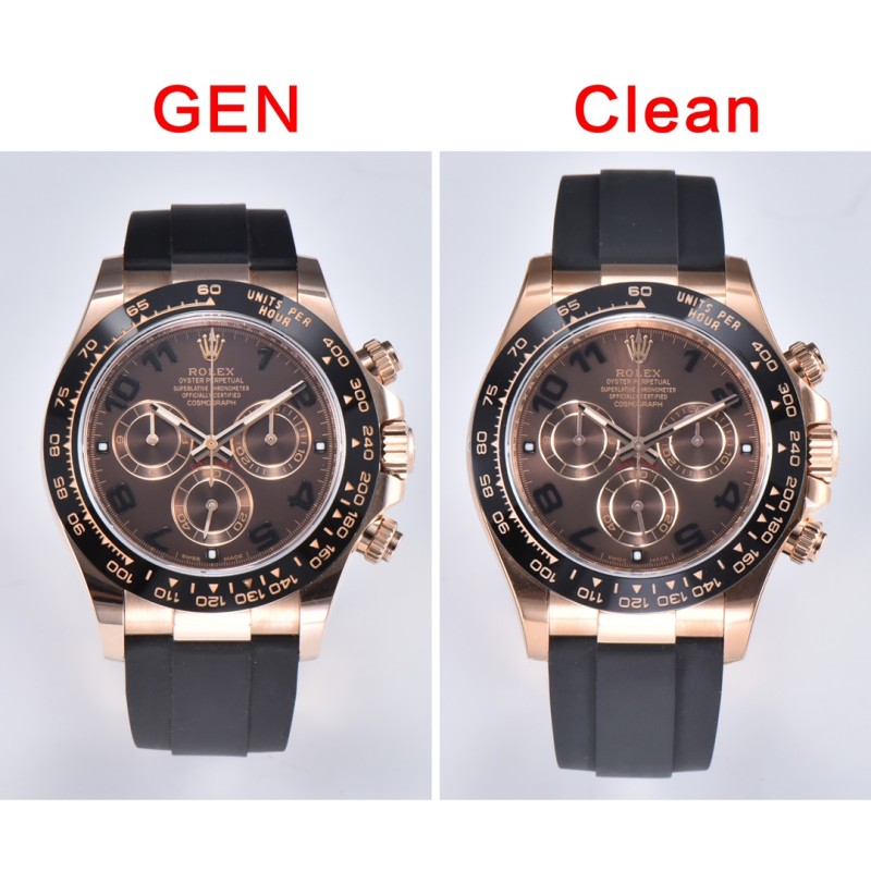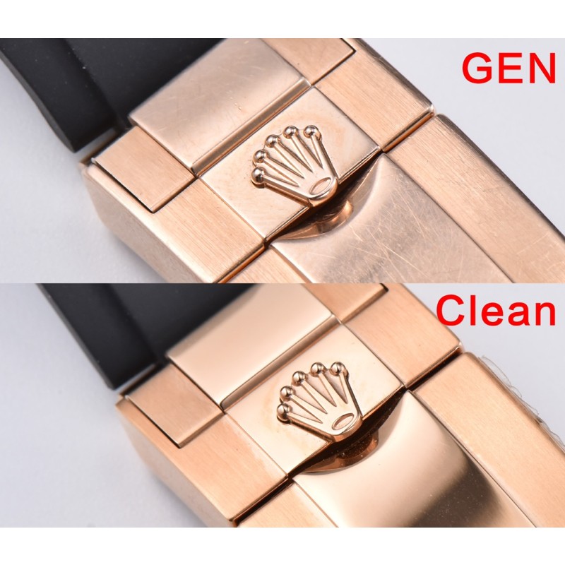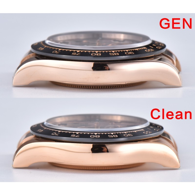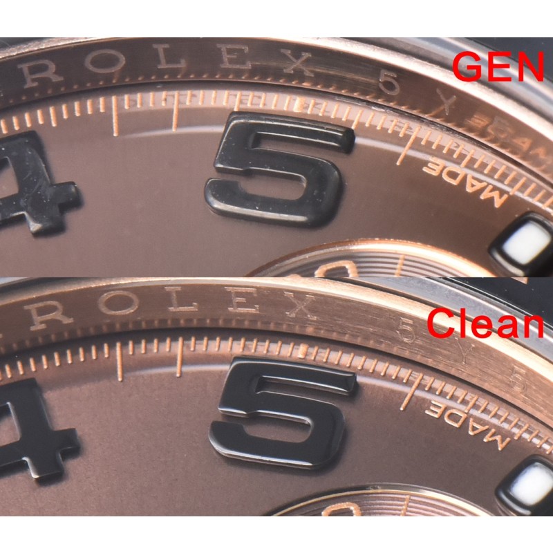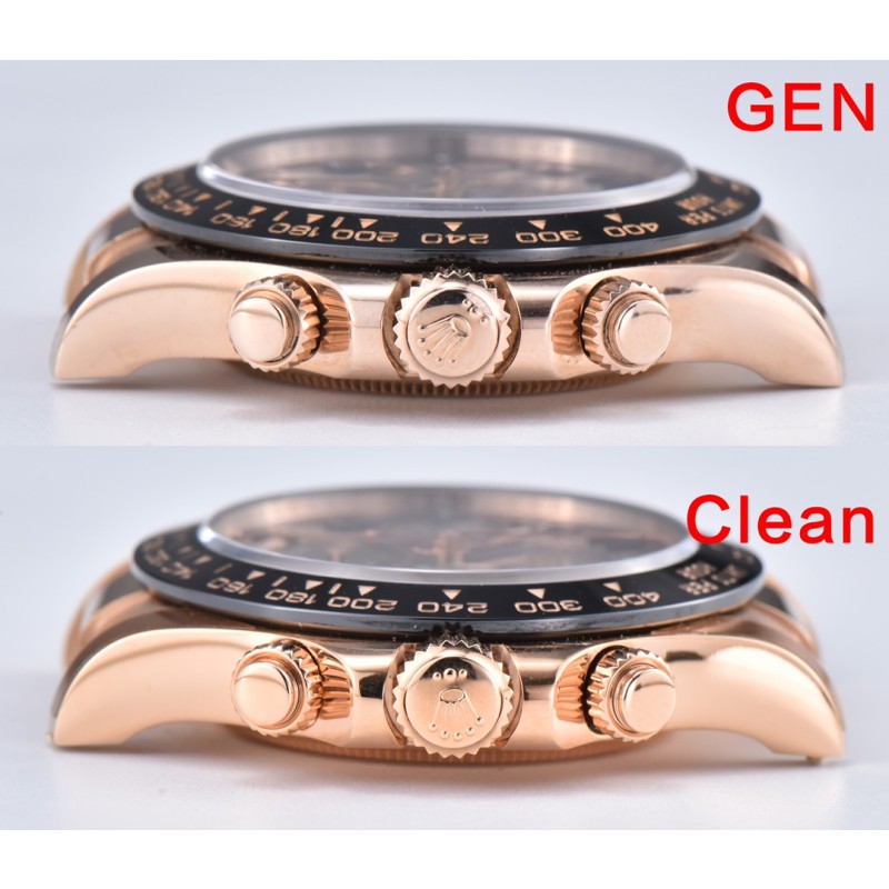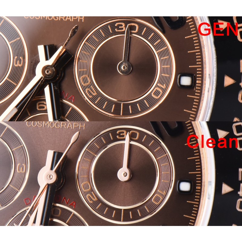 clean厂116515玫瑰金巧克力热门款迪通拿 1.本次推出的是全金迪通拿 2.咖啡色表盘+黑色数字钉 玫瑰金款式中相对热门的配色 黑色数字钉有打磨圆角处理 3.也是使用3段式拼接头粒,全部散件电镀。 4.表圈部分的字体粗细,以及最重要的,黑色填油是和原装一样的,磨砂质 感。这也是唯一一个做到的,后续发细节图又对比。 更多细节可以仔细看真假对比图