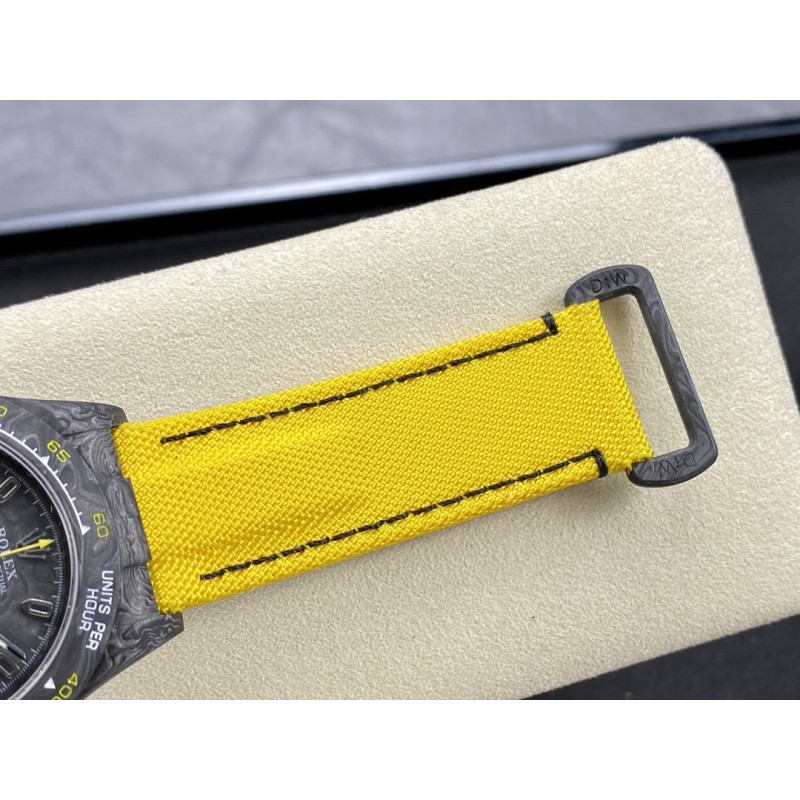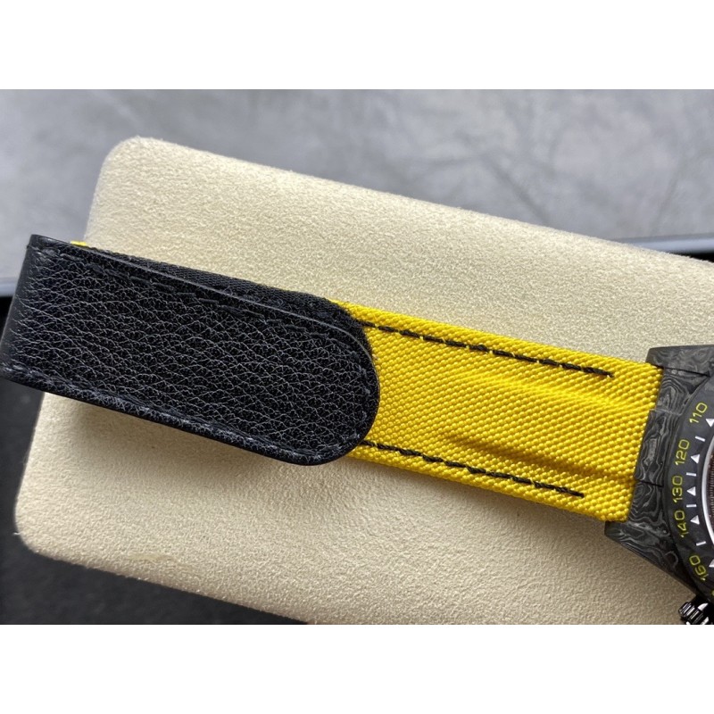 2023年新品,超级碳纤维Diw定制版 4130宇宙计时迪通拿系列 腕表直径为40MM,和普通的迪通拿尺寸都一样。整表重53克,表壳整体采用碳纤维材质,碳钎维材质是一种新型材料,颜色为永不过时的黑色,整体的纹路十分典雅、奢华。碳纤维外柔内刚,质量比金属铝轻,强度却高于钢铁,并且具有耐腐蚀。表壳哑黑色纹理多变,并且每一枚碳纤维腕表会因切割方式有别而展现出不同的纹路,成为独一无二的存在。表带是魔术贴的设计,正面尼龙材质,背面牛皮材质,表扣材质同样为碳纤维.