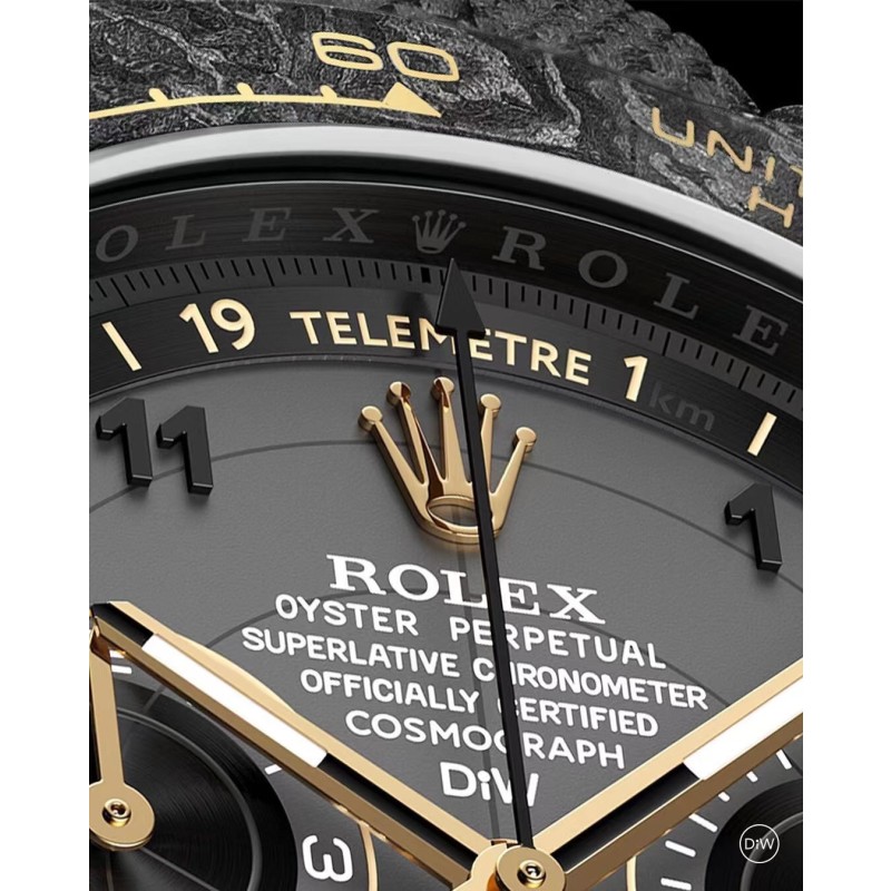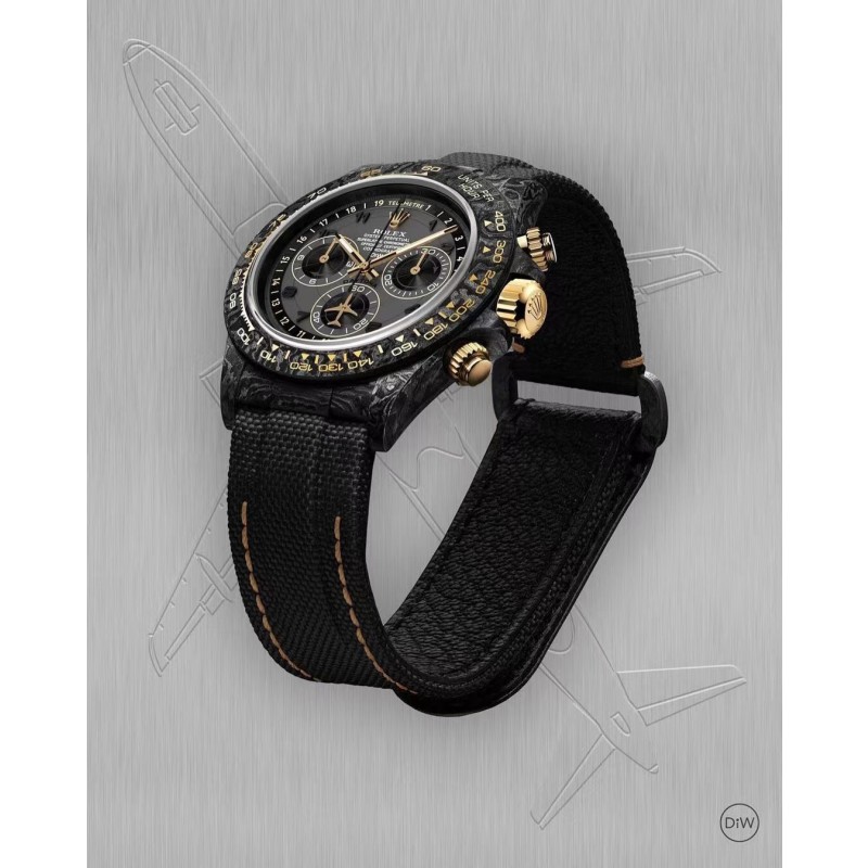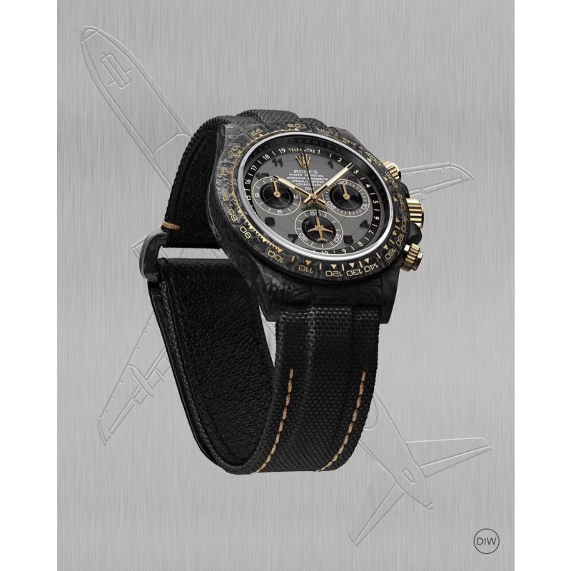 Diw 劳力士碳纤维迪通拿 更新了4款颜色 分别为: 1、沙漠之鹰阿拉伯语(Desert Eagle Arabic):灵感来自沙漠的美丽色彩,阿拉伯刻度和深棕色搭配能让你身临其境到沙漠里。 2、黄金精华(Golden Essence):香槟金色表盘搭配黄金色圈口和白石英纤维壳身。 3、艾维亚灰(Avia Grey):以灰色表盘为主题 比较有意思的是表盘还配有1-19测距仪刻度,此款最大亮点在于6字位秒针会一直转,这是一个新的创新尝试。 4、奶油反转金(Cream Invert Gold):西装暴徒定制款,黑色表盘配香槟金色外圈刻度,凸显简约高贵。