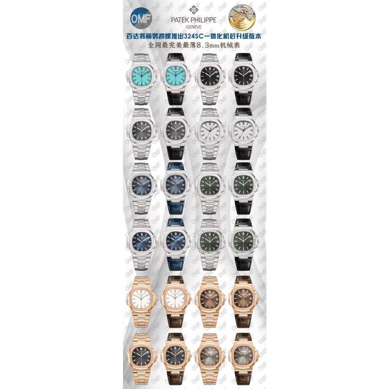 OMF 百达翡丽, 鹦鹉螺系列8.3mm 一体机 鹦鹉螺推出升级版本,1升级机芯全部精雕刻字,清晰不磨损,纹理做到极致。2自动陀片.降噪音.3.omf厂高品质9015改324SC一体化机芯.4..升级表盘刻度夜光超亮,而且整体做到和谐一致同步亮度。5.鹦鹉螺经典蓝盘,目前改进与正品一致的颜色.6.日历窗口每一只手表做了水平正位,不出现偏斜遮挡。7.把头调节档位顺畅度的多次调试,调试到最佳状态手感畅顺8.升级了整个手表厚度8.3毫米,完美实现全网最薄机械表,等同原装厚度。佩戴起来舒适无比。