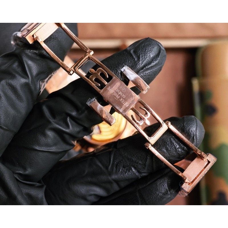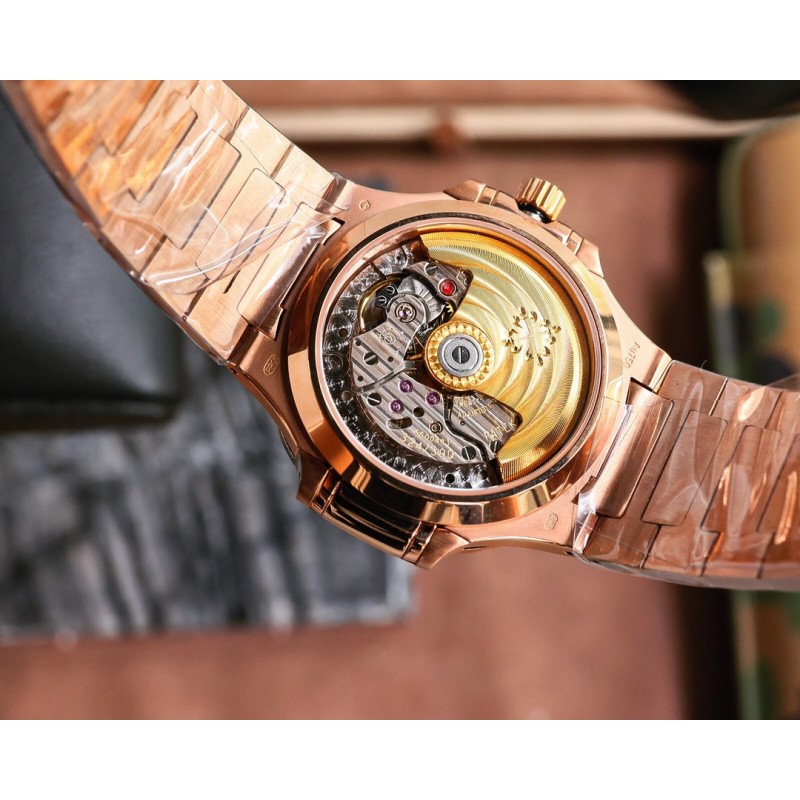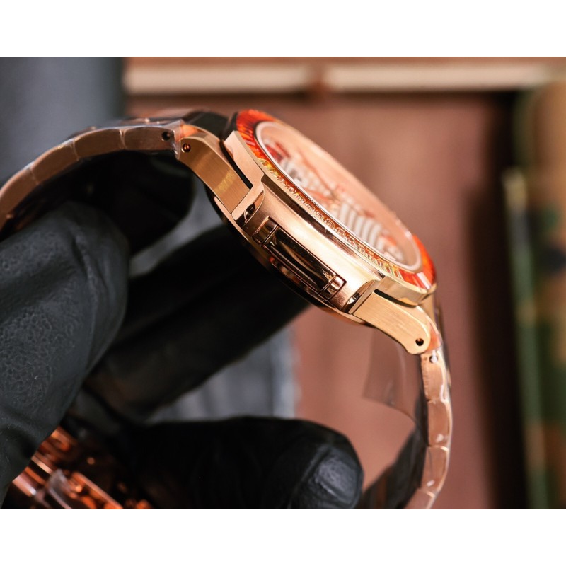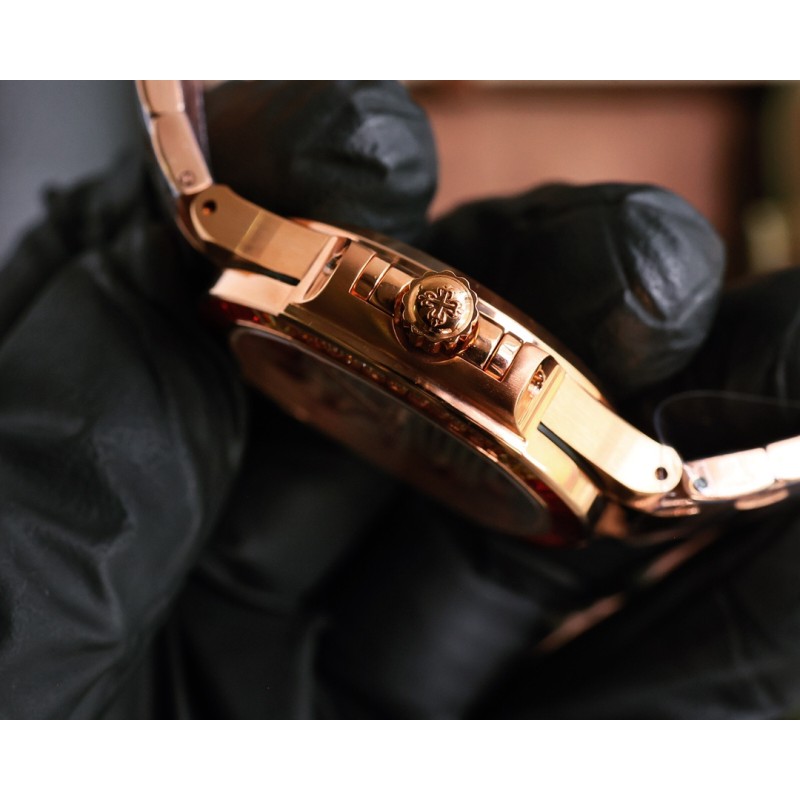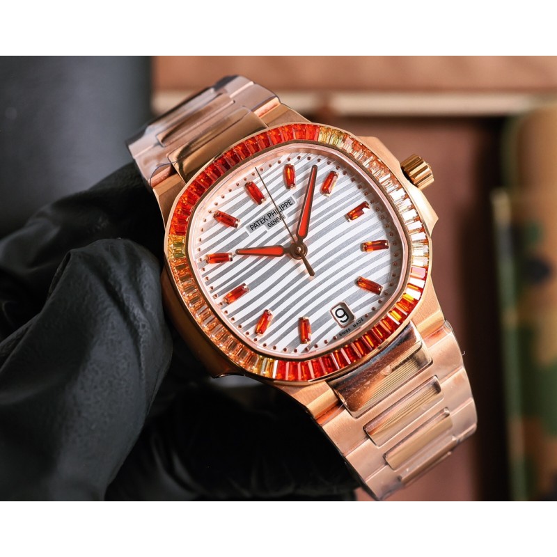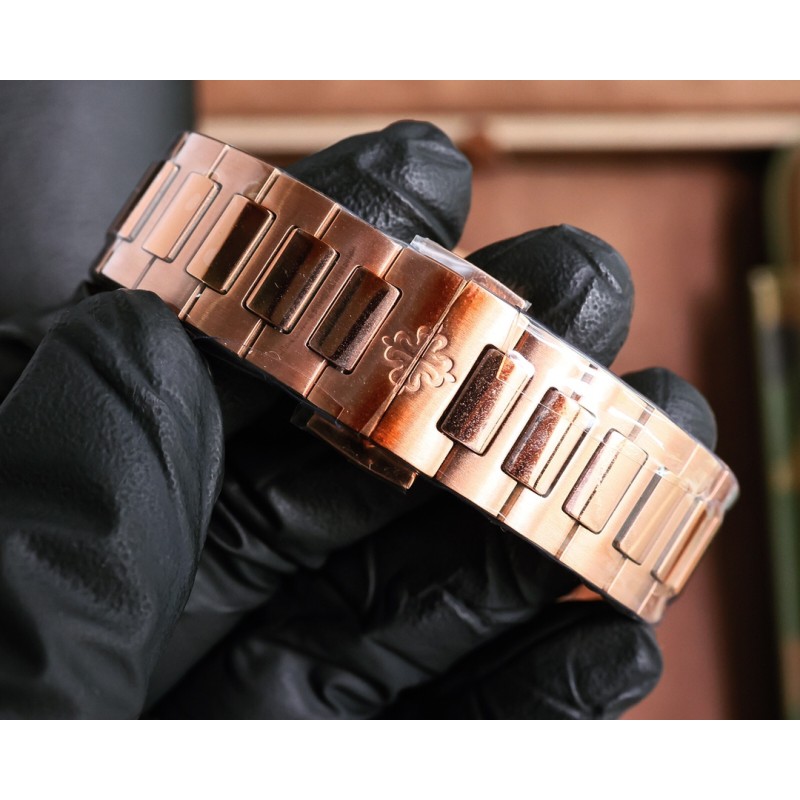 2100GR百达翡丽Nautilus女式腕表推出全新珠宝款式 赠送价值288旅行便捷定制手表表盒 八角形表圈镶饰双排68颗长形锰铝榴石,呈现自干邑色(12时和6时位置)至香槟色(9时和3时位置)的双重渐变效果。表盘镶嵌尖顶形干邑色锰铝榴石时标。光影流转之间,这款珍稀杰作尽展现代韵致。 表盘饰以Nautilus女式腕表特有的波纹图案,确保清晰易辨,体现百达翡丽对可读性的追求,即便是珠宝腕表也不例外。 腕表 定制9015改324SC自动上弦机械机芯 机芯视窗式日期显示。中心大秒针。 表盘 镀玫瑰金表盘,“波纹”图案,尖顶形干邑色锰铝榴石时标。 表壳 玫瑰金。蓝宝石水晶透盖。防水系数60米。直径(10时至4时位置):35.2毫米。同步正品 表带 玫瑰金新扣款式