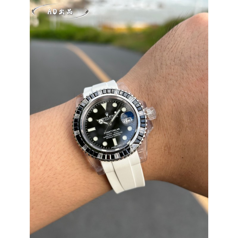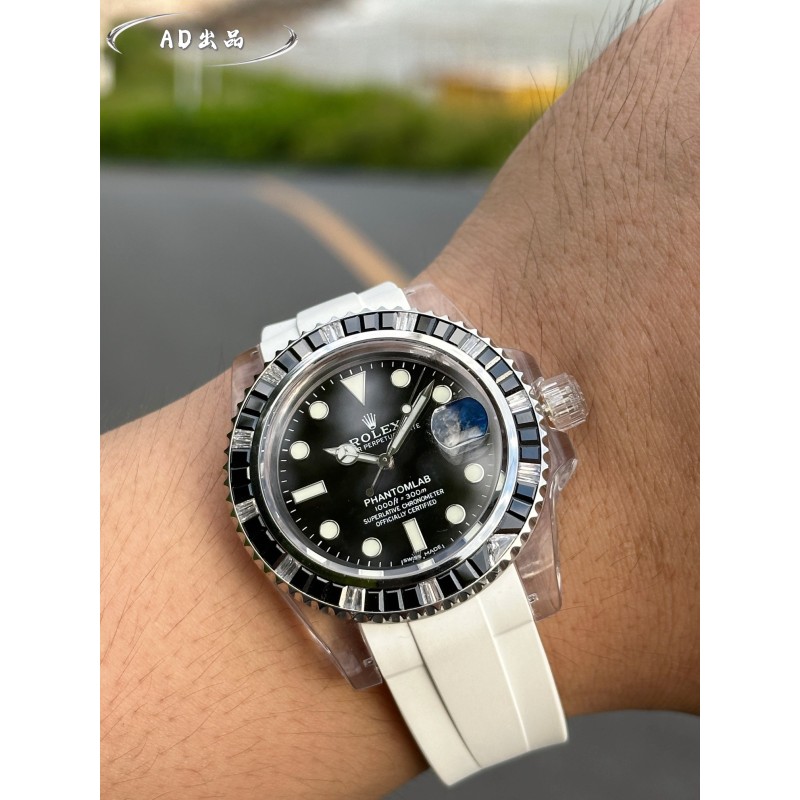特价:1150,『赠送胶带一条,颜色随机』 劳力士-Phantomlab改装力作进口透明胶壳套!结合优雅现代美学和精湛制表工艺,首次推出具有出色硬度和耐磨性的进口水晶《玻璃水晶材质》,质感纯净而通透,白色胶带是:《氟胶》比橡胶高一个档次,外送一条透明胶带:《TPE的材质》,劳力士水鬼整体结构不变的前提下,首次打破了劳力士密底结构,完美诠释了劳力士心之美。全系列采用了瑞士ETA2824全自动机芯,字面,圈口,面丁,针,都采用进口蓝色夜光,蓝宝石玻璃(蓝光放大镜)用匠芯打造奢华的极致!男士休闲 女士时尚 泡妞神器AD出品 精品不断