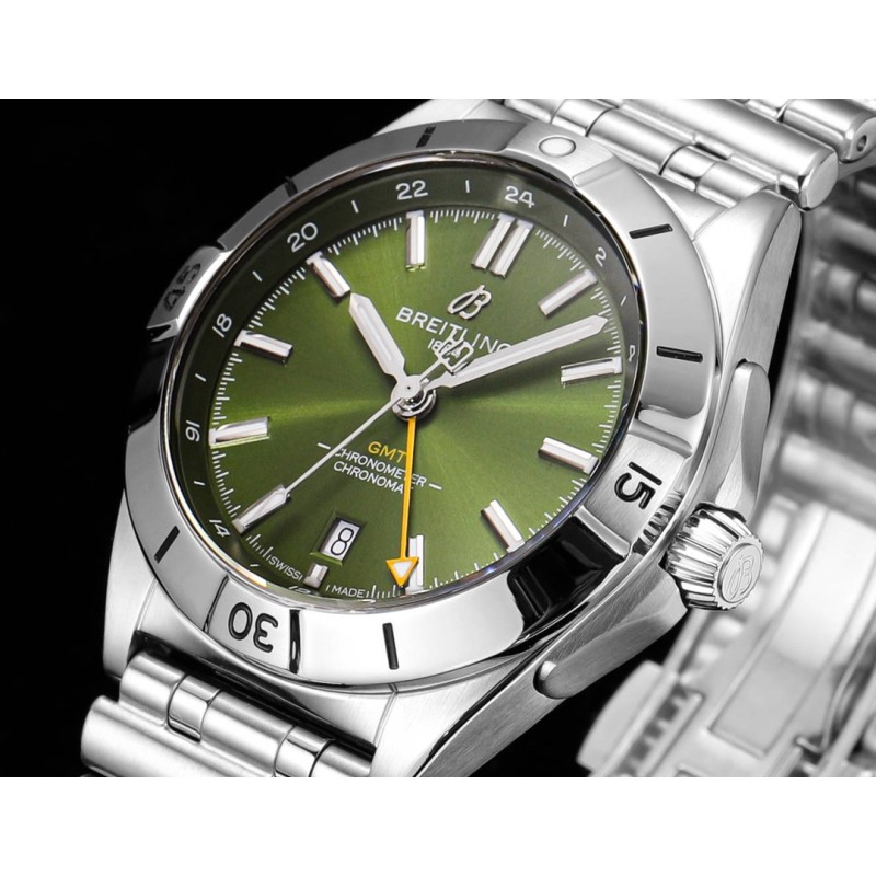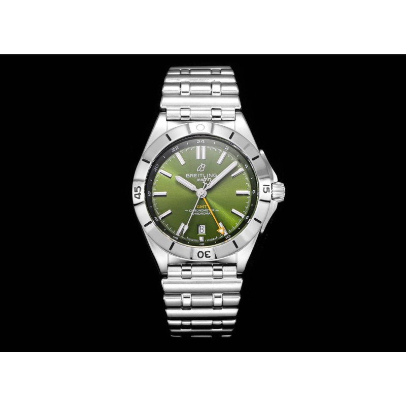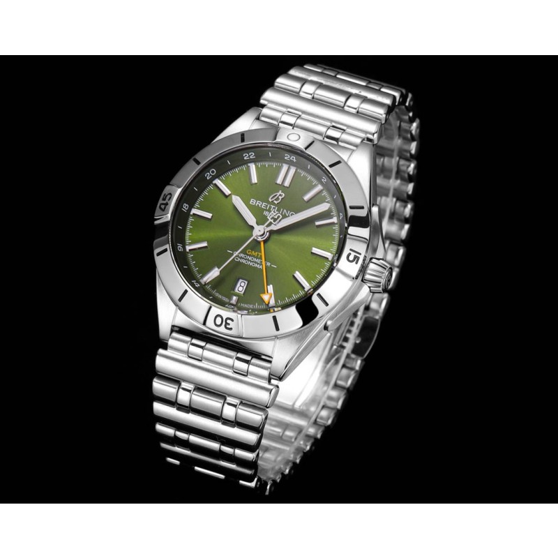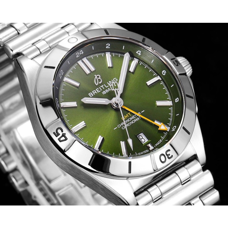 统一1850 百年灵BREITLING,机械计时系列A32398101M1A1!(Chronomat Automatic GMT 40)重磅来袭! 1这款双时区腕表盘面简洁凌厉,读时清晰。黑色,蓝色,绿色,白色,烟煤灰,蓝间黄,冰蓝,蓝间蓝,九种盘面色彩选择,款款让人爱不释手! 2表壳采用精钢制成,配备带有双密封垫的旋入式表冠,优良防水性能。精钢表圈单向旋转,装饰标志性的15分钟“骑马钉”! 3钢带为备受关注的蝴蝶扣辊珠精钢表链因其类似“子弹”的外型被称为“子弹链”。 4表壳尺寸为40毫米,适合亚洲跟中国男士手腕! 5机芯采用etc.2836 GMT两地时!让需要国内外两地通用时间需求更加实用!做到两地不误! 虽然姗姗来迟,但诚意满满!匠心之作,你值得拥有