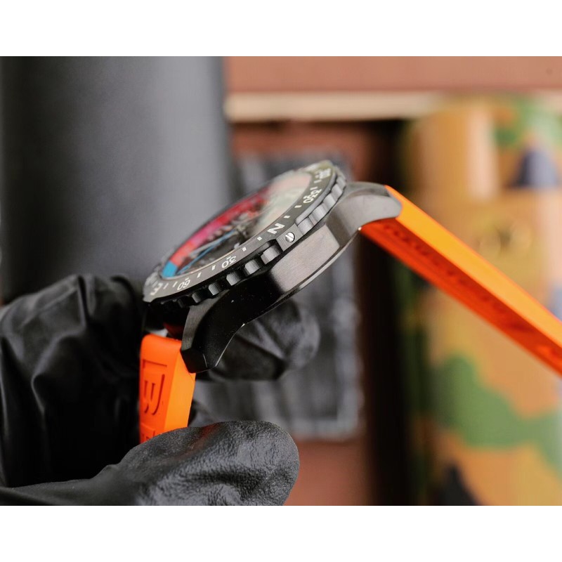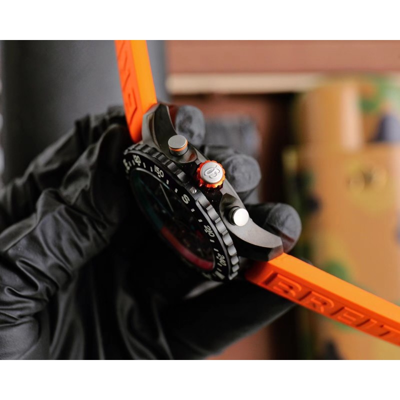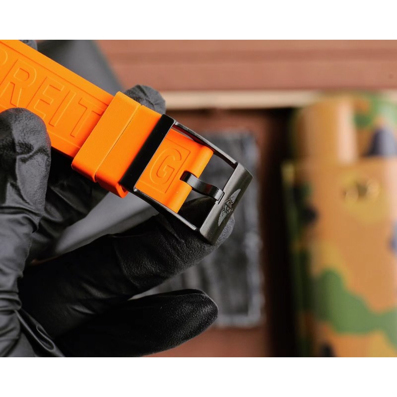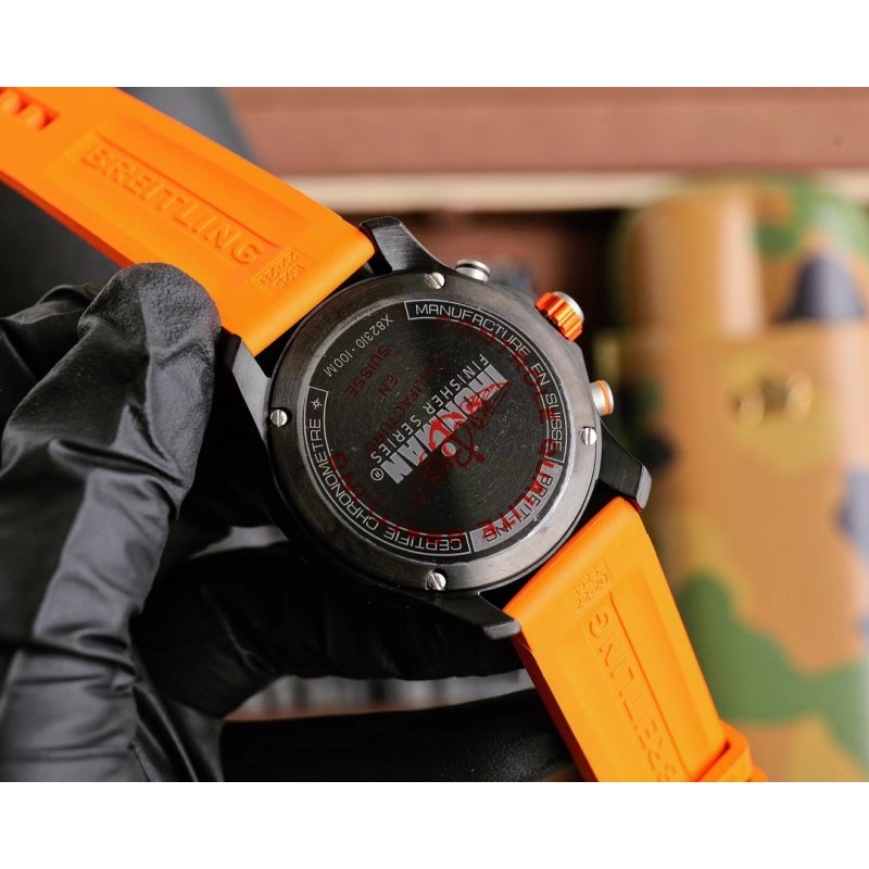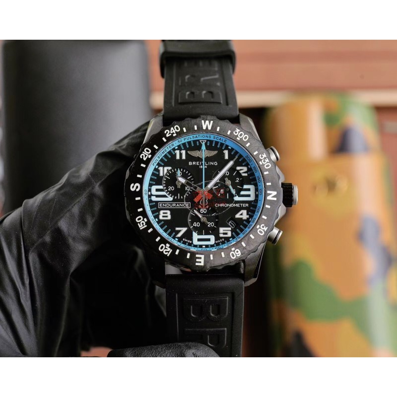 黑壳800 Breitling 百年灵推出一枚色彩醒目的新作品——是集高精准度、创新技术与动感色彩搭配配于一体的理想型奢华运动腕表,一经推出就吸引了众多专业竞技运动员与体育活动爱好者。1 44mm 精钢表壳使用数控精雕而成,线条精致流畅圆润,双向旋转表圈上刻有 N、S、E、W 四个基础方位和360°刻度,让佩戴者可以计算方向。2表盘时标着重放大“3”、“6”、“9”,便于读时;时标和指针涂覆了超强夜光材料,保证夜间清晰读时;脉搏计刻度印制于彩色内表圈,你只需要启动计时功能,记录30次心跳的耗时,就能直接换算出自己每分钟的心跳次数。表盘2点为1/10秒计时盘,日历窗位于4点和5点之间,6点为小秒针,10点是30分钟计时盘。3蓝宝石水晶玻璃,双面防眩。4搭载原装超级石英机芯,这款机芯经过 COSC 官方认证,其精度是传统石英机芯的十倍。5越南进口橡胶材料表带,拥有耐磨性和抗腐蚀性,可选红、橙、黄、蓝、白、黑六种款式,色彩缤纷,活力四射。