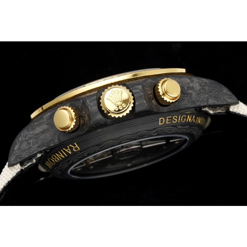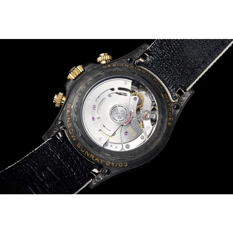 DiW 打造 Rolex Daytona 全新定定制款「Rainbow Sunray」阳光彩虹 以阳光为灵感的彩虹圈,整只表散发出和煦的金黄光芒,看起来既耀眼又温暖。在面盘设计部分,外围刻度环为米黄色,至于面盘内侧则是黑色,包括三枚小表盘的刻度环也都是黑色(但有做出太阳纹与纯粹黑色的面盘形成自然层次)。透底可见的4130机芯,更具有机械质感,并搭配了佩戴舒适的皮质内衬 NATO 规格尼龙表带。推出2款颜色可选,玫瑰金/黄金