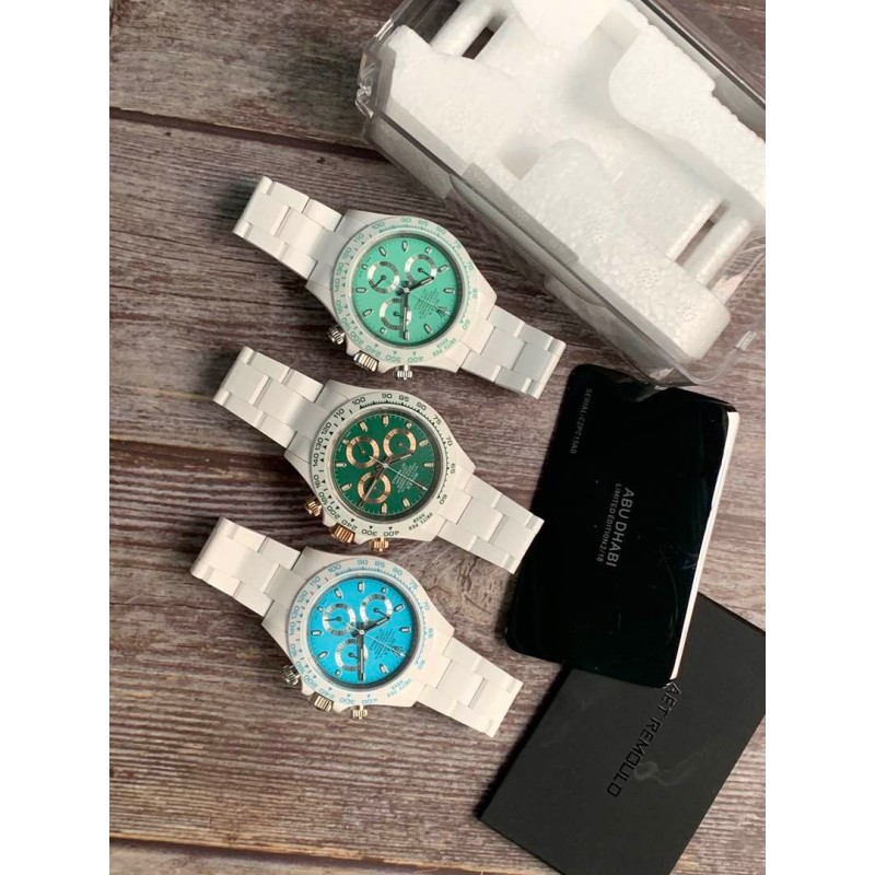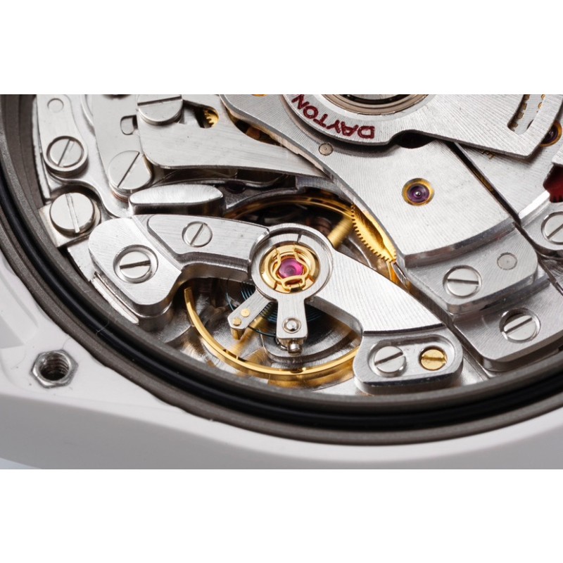 这款腕表将其中极具代表性的赛道颜色——阿布扎比蓝,融入到腕表设计中,覆盖于表盘与表圈数字,彰显出赛车运动的速度感,不得不说这样的设计理念十分独特,既保留了迪通拿原始造型,又巧妙融合了改造理念!纯净的蓝色总会表现出一种美丽、冷静、理智、以及沉稳的特性,所以它被运用到各种商品上,改装表也不例外。将莹莹之蓝与腕间结合,使得腕表散发出独特魅力。置于腕间,不但可以提升自我品味,还可以为自身形象加分。表壳和表带也完全由白色陶瓷打造,这是一种十分脆弱且在制造过程中容易破裂的材料,几乎很少在腕表上看到这种材料的应用,但这种材料的成品效果却是独特的,不仅看起来简洁纯净,还拥有温润如玉的佩戴感,并且十分耐划。值得一提的是如果是对钢材质过敏的朋友,佩戴陶瓷材质的手表是不会有过敏反应的!陶瓷材质由于本身材质硬度高,所以它一般都不易出现刮伤、掉色等现象。但是正因为硬度高,它就没有韧性,就比较易碎,所以当我们在佩戴过程中,一定注意不要用力磕、碰、摔。因为陶瓷表壳不能修复,只能更换陶瓷部件,一旦损伤,恢复成本比较高。