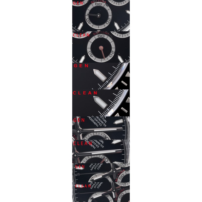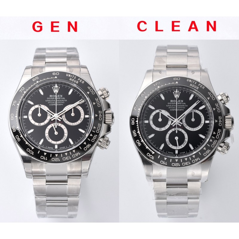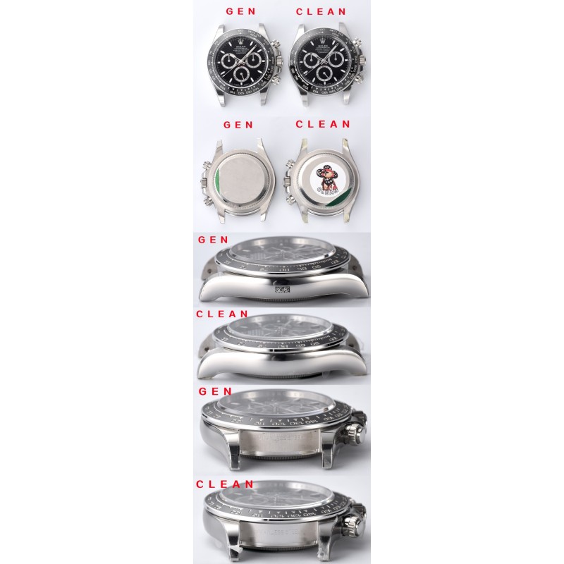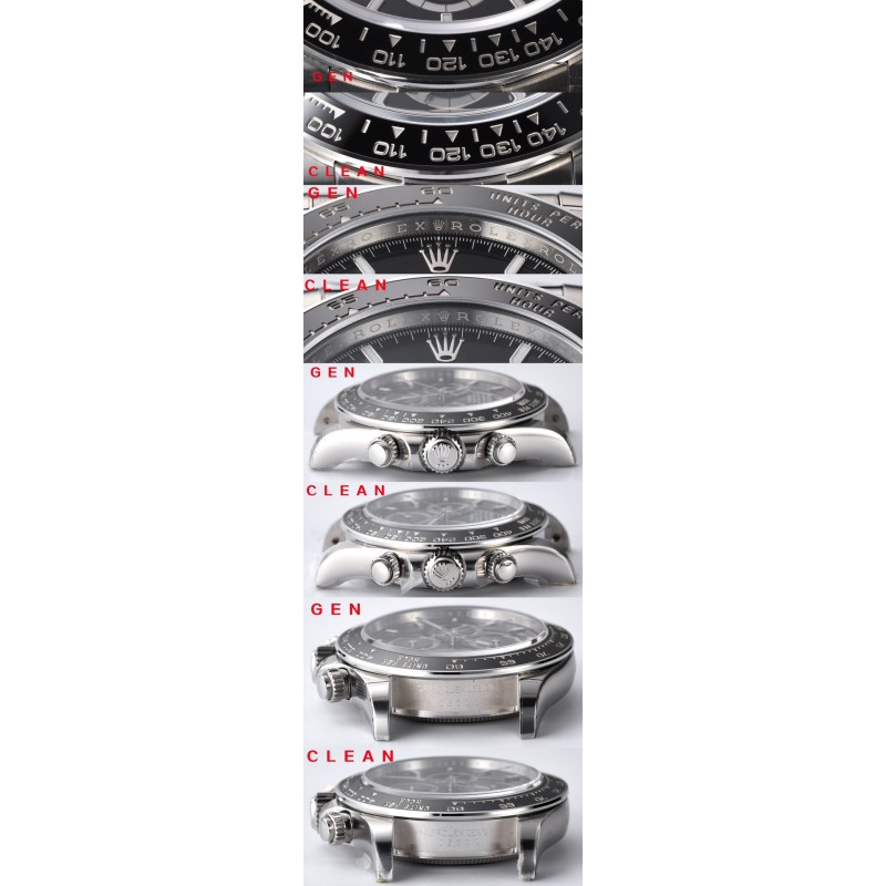 c厂4131新款 126500 黑色 通过图片对比大家比较关注的点 表盘的三个银色小圈,4131更新最大的部分,小圈边缘多了一个亮圈,这点clean做的很好,斜度、亮度。但是银灰色的小圈,我个人觉得底纹相对于真品还不是那么细腻,但是肉眼不可见,具体可以看自然光对比。 其他部分 字钉 夜光 做的也很好/ps:上面有讲到真品4131以后指针的管头更改为圆柱形,但是clean提供的4只真品,我们发现了几个问题,例如 字钉的圆润度存在差异,指针有使用老款的锥形管头,所以劳力士官方可能在清理4130的库存。 表壳 表带上面也有图片对比,整体外观差异不大。 虽然这次时间特别紧张,但是clean在第一时间购买真品五只,据说手表本身的价值跌幅已经超过10w美金,这个当中不包含已经拆卸的手表,以及损坏的零件。 我仔细看过真假实物,也通过拍照进行对比,我个人觉得是一次非常好的创作。 选择sh4131当中有非常复杂的关系,但是希望大家能够理解 sh不等于低端品质,同样clean也从来不会因为想获取更多的利润从而降低采购成本,clean告诉我,这次sh4131机芯采购成本并不比dd4130低。 可能因为光线的问题。会附上自然光实拍图,我觉得可以以实拍图为准。