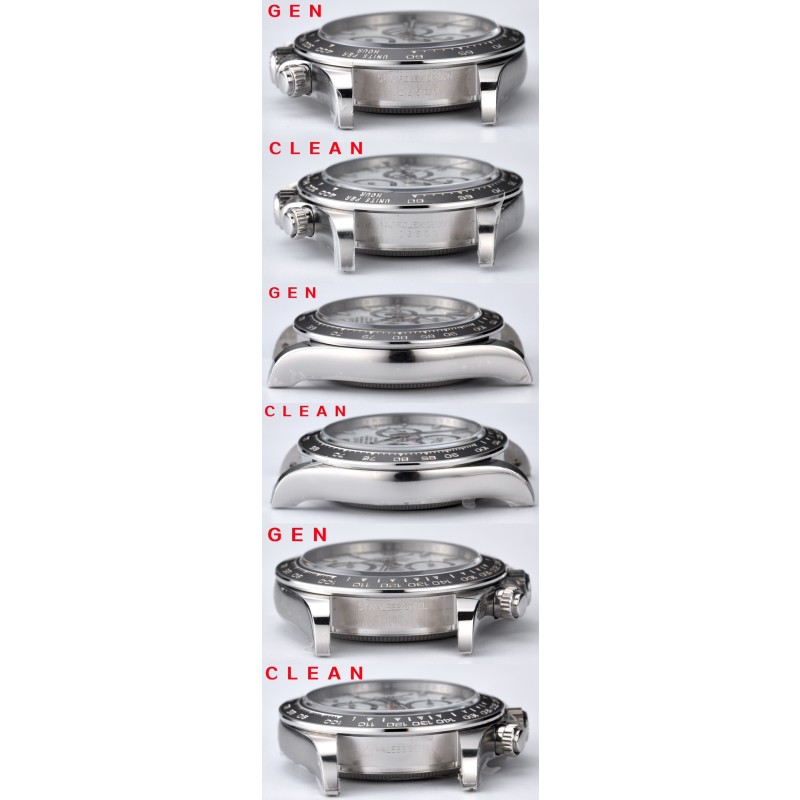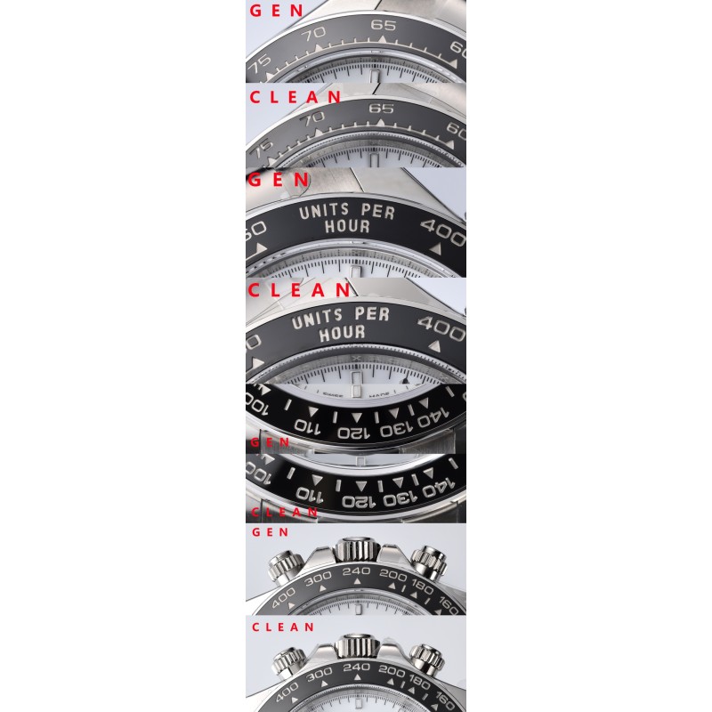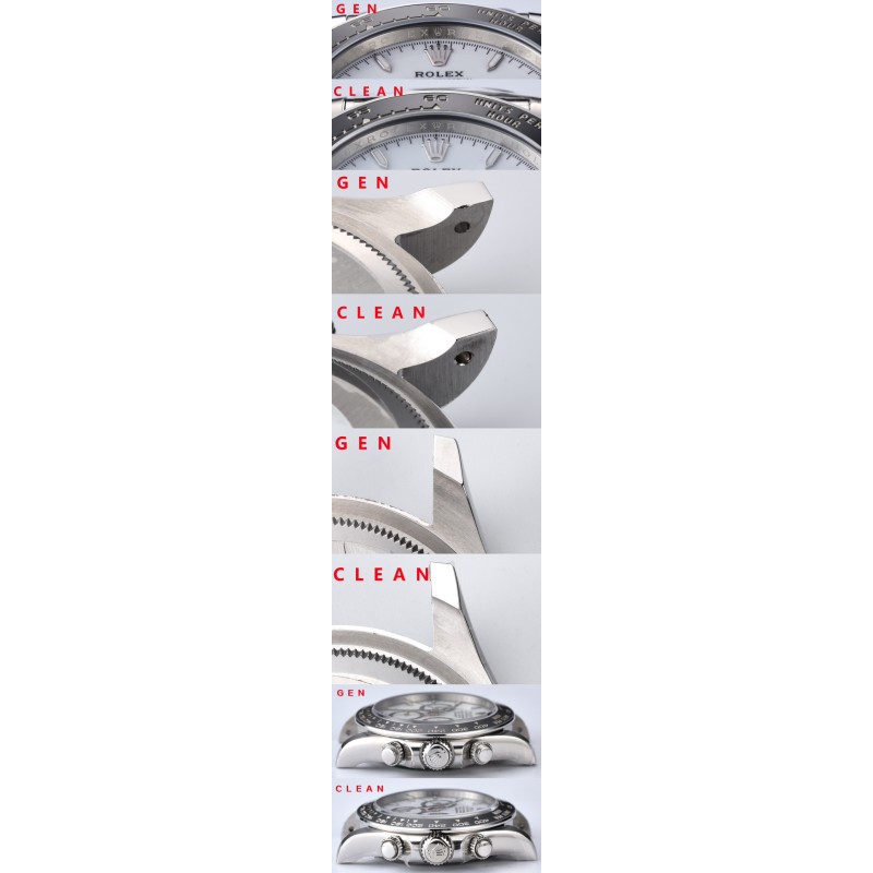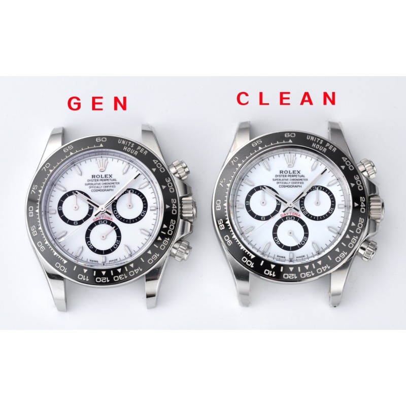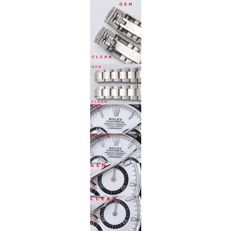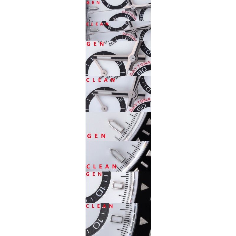 c厂4131新款 126500 白色 其实在116500上我们就讨论过关于白色表盘的问题,当然了真品也有好几个版本,例如 冷白色,暖白色。等等 这次126500真品我们看到的是暖白色和冷白的中间色,clean这次颜色也做的非常棒。 其他部分 字钉 夜光 做的也很好/ps:上面有讲到真品4131以后指针的管头更改为圆柱形,但是clean提供的4只真品,我们发现了几个问题,例如 字钉的圆润度存在差异,指针有使用老款的锥形管头,所以劳力士官方可能在清理4130的库存。 表壳 表带上面也有图片对比,整体外观差异不大。 虽然这次时间特别紧张,但是clean在第一时间购买真品五只,据说手表本身的价值跌幅已经超过10w美金,这个当中不包含已经拆卸的手表,以及损坏的零件。 我仔细看过真假实物,也通过拍照进行对比,我个人觉得是一次非常好的创作。 选择sh4131当中有非常复杂的关系,但是希望大家能够理解 sh不等于低端品质,同样clean也从来不会因为想获取更多的利润从而降低采购成本,clean告诉我,这次sh4131机芯采购成本并不比dd4130低。 可能因为光线的问题。会附上自然光实拍图,我觉得可以以实拍图为准。