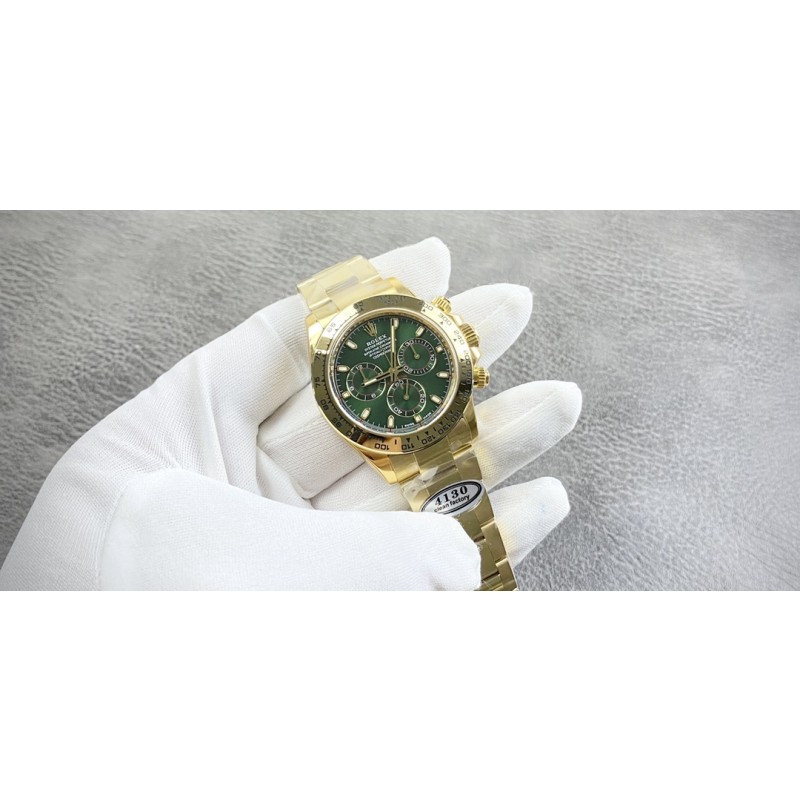 (严选)劳力士迪通拿116508系列,绿金迪!搭载丹东4130机芯,完全可以平替原版30多个w的货!40mm直径,电镀厚金,经久耐用!本次最大的特点在于这张金绿色的表盘市面上唯一对版的绿色。但是产能非常有限。表带部分也是使用3段式拼接头粒,全部散件电镀。表圈部分的字体粗细,以及最重要的,黑色填油是和原装一样的,磨砂质感!clean厂出品,出货实拍