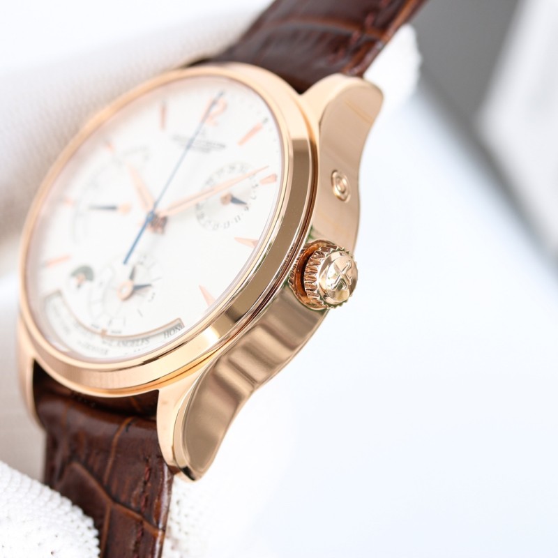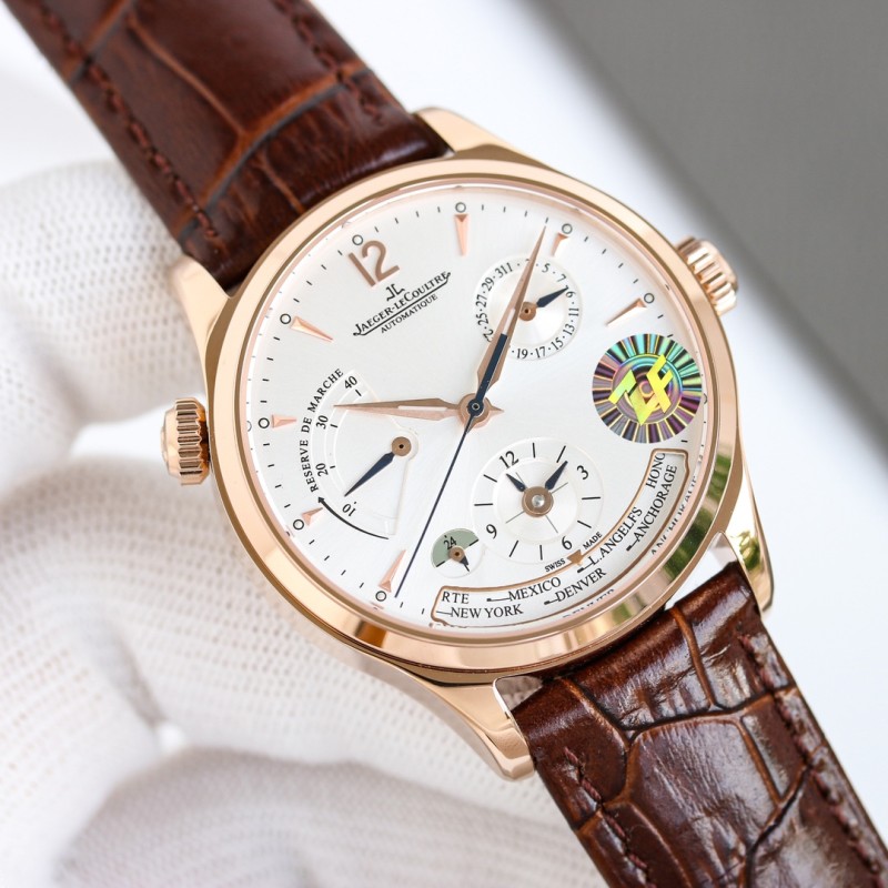 ZF积家大师系列 腕表标志性特点就是拥有多时区显示功能,将全世界呈现于手腕间,即使是夏令时的特殊性也考虑在内。腕表采用的为精钢表壳打造,39毫米的直径设计,在表盘布置上可以说是下足了功夫,拥有多项复杂功能但是表盘依然井然有序,10点钟的动能显示窗,2点钟的日历显示盘,以及6点钟位置的第二时区显示盘,还有最下面的世界时显示窗,搭配的完美无瑕,堪称经典之作。搭载积家自动的CaL.939自动上链机芯,腕表配有鳄鱼皮纹路表带,积家原装专用扣,佩戴舒适而且方便