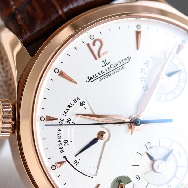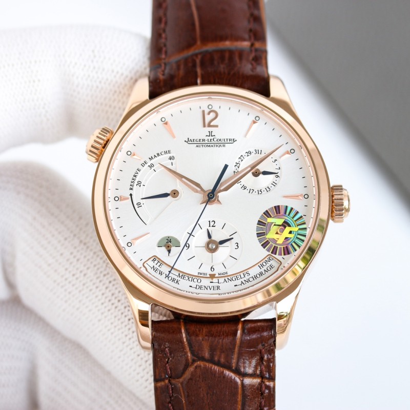 ZF积家大师系列 腕表标志性特点就是拥有多时区显示功能,将全世界呈现于手腕间,即使是夏令时的特殊性也考虑在内。腕表采用的为精钢表壳打造,39毫米的直径设计,在表盘布置上可以说是下足了功夫,拥有多项复杂功能但是表盘依然井然有序,10点钟的动能显示窗,2点钟的日历显示盘,以及6点钟位置的第二时区显示盘,还有最下面的世界时显示窗,搭配的完美无瑕,堪称经典之作。搭载积家自动的CaL.939自动上链机芯,腕表配有鳄鱼皮纹路表带,积家原装专用扣,佩戴舒适而且方便