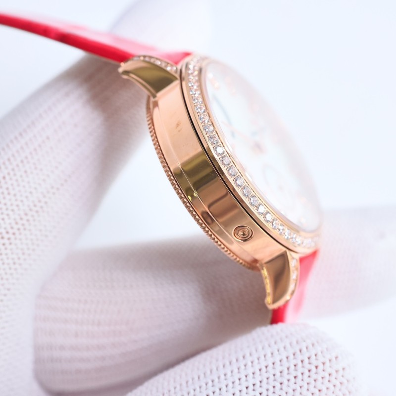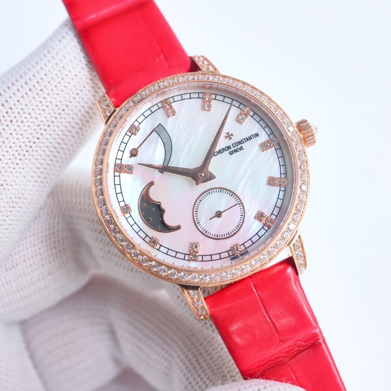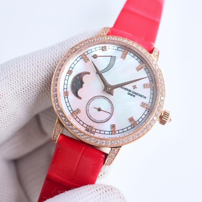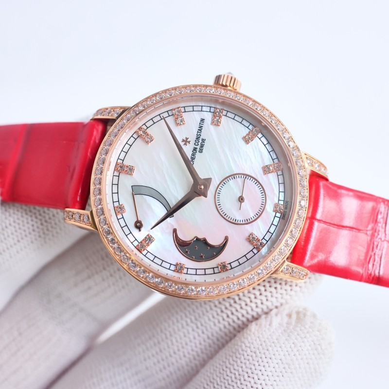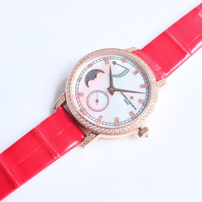 白钻 1600 金钻 1650 全钻面200 江诗丹顿 VC GV1 传袭系列 月相腕表搭配直径36毫米 圆形白金表壳,表圈、表耳和表冠镶嵌了总重约1.2克拉的81颗美钻 白色珍珠贝母表盘之上配备了高级腕表所有复杂功能当中最富诗意的月相盈亏显示功能。 腕表搭载由江诗丹顿自主研发并制造的机芯,动力储存约72小时,可为小时、分钟、小秒针及月相盈亏显示功能提供充足动力。 腕表还搭配了低调优雅的意大利小牛皮带优雅柔媚的设计是日常搭配的上佳之选。S1精致推荐女士多功能机械腕表