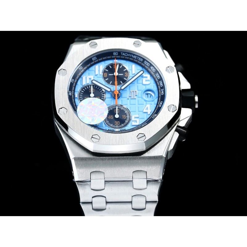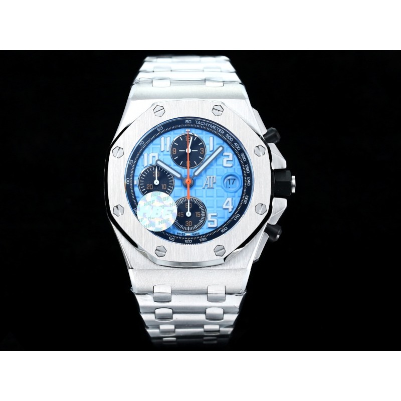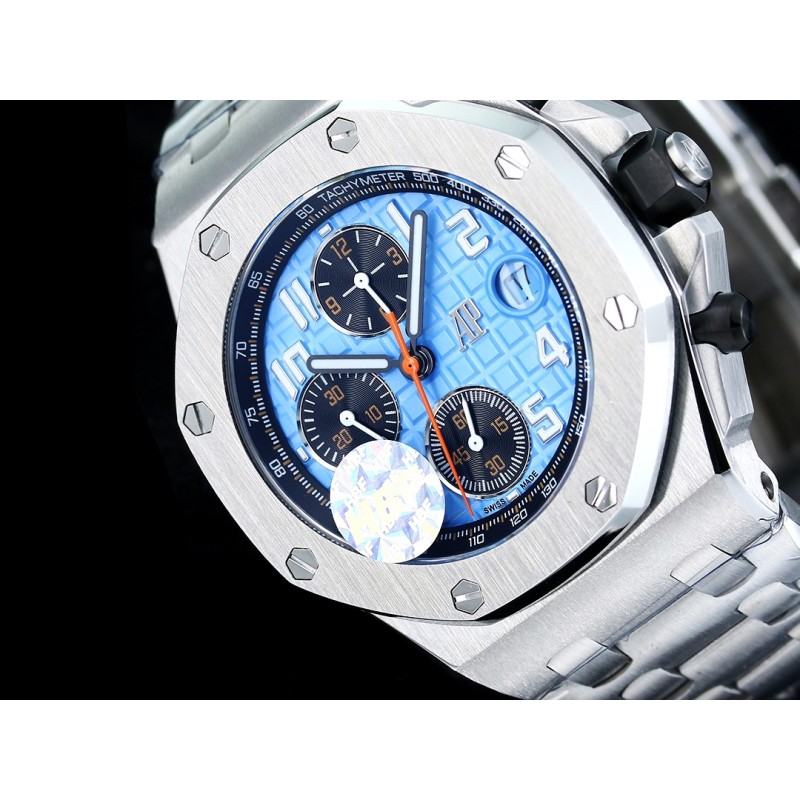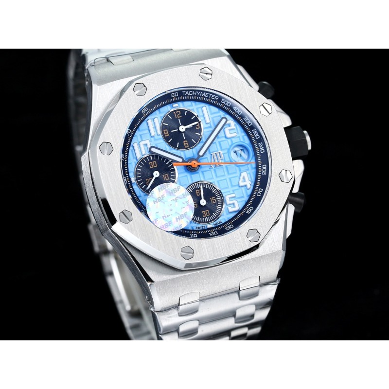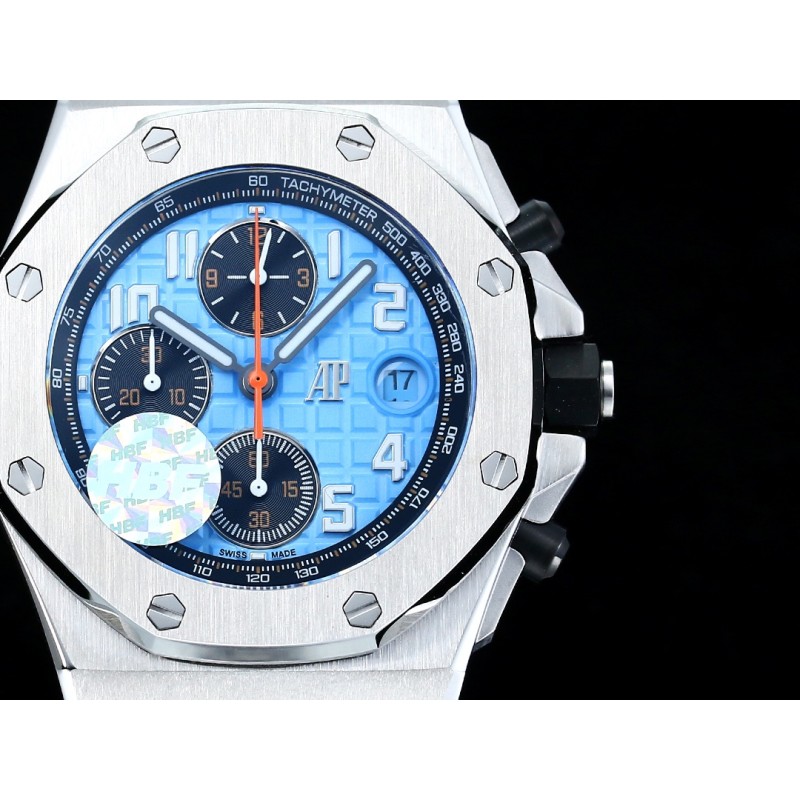 钢带同价 2400 HBF FACTORY 爱彼 皇家橡树离岸型系列26238:封顶之作 杜绝一眼假”在JF厂原有的基础上 潜心研发 突破壁垒 “打破原装封锁技术,同步原装独家计时码表款可松动头粒”使上手最大程度贴合手腕,大大提高了佩戴的舒适 同时也杜绝一眼假的尴尬处境。HBF厂真正做到从每一个喜欢手的表友角度考虑 2.采用最新CNC级别的打磨技术,将整个表壳的个个角度完美处理,3.每颗六角螺丝都与表框处于同一平面上,不接受一丝一毫的凸显与凹陷,真正诠释了何为顶级复刻艺术 4.表盘以爱彼经典的大格纹为背景,层次分明的方格排列,经过完美打磨,将匠人的工艺体现的淋漓尽致 5.镜面采用双面蓝宝石镜片,天然氟橡胶皮带,6.机芯采用原装3126的计时机芯,十二位的小秒,6点钟位和九点位的12小时计时与30分钟计时,完美的还原了原版的所有功能,每块手表都经过人工QC确保机芯的稳定性,真正做到无可挑剔