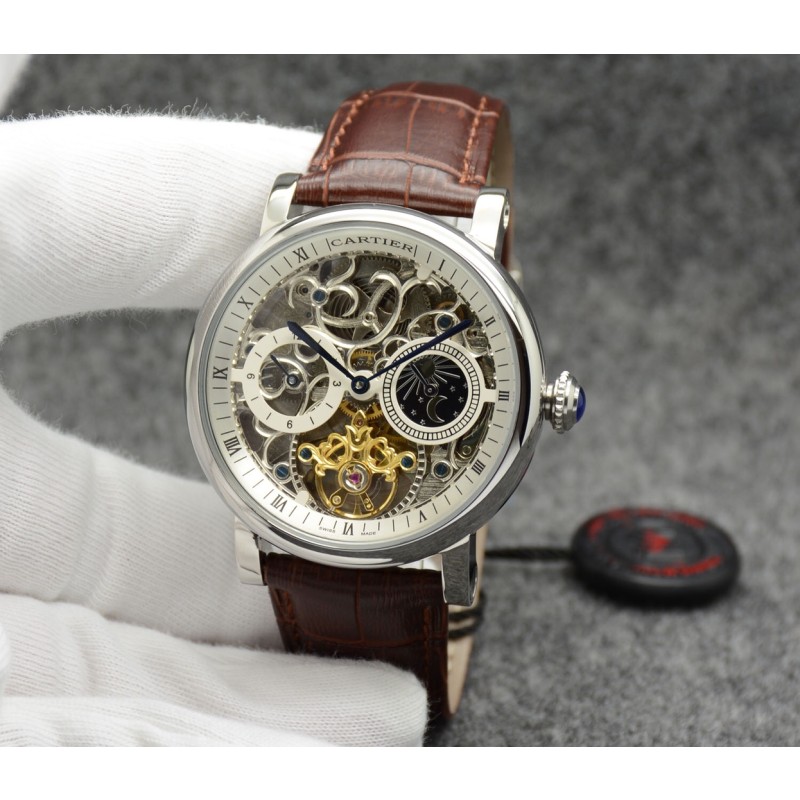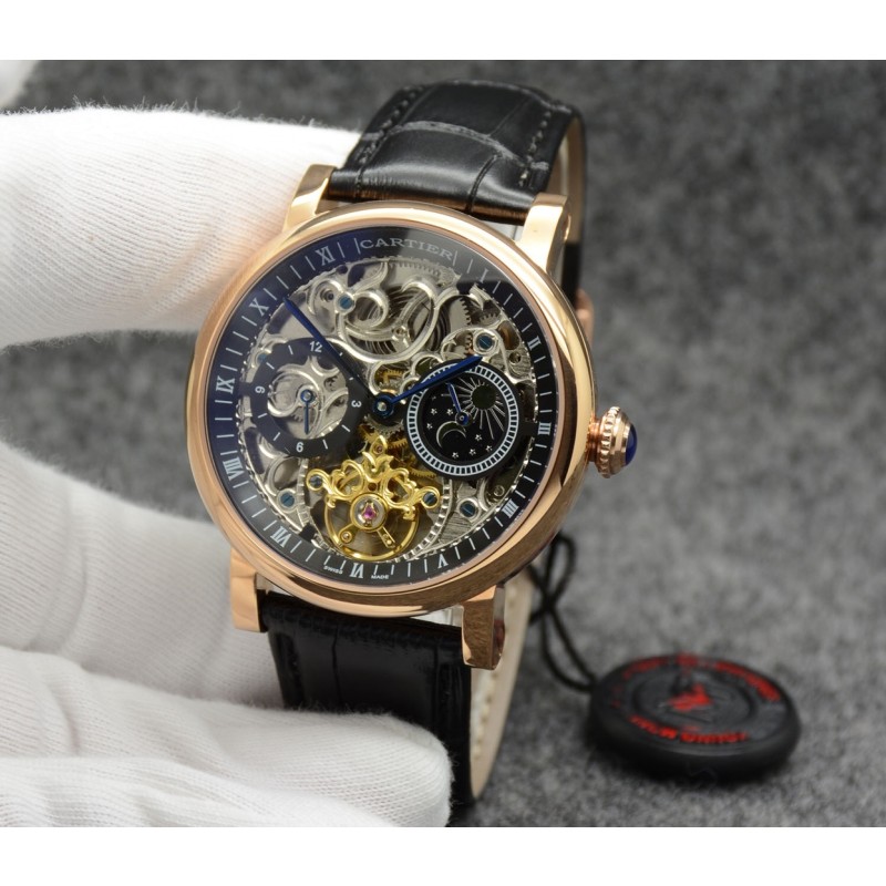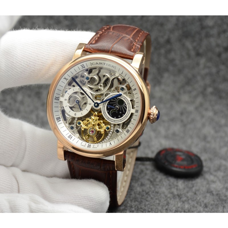 卡地亚 Cartier最新款男士机械腕表[悠闲] [鼓掌]精钢表壳,抛光打磨!表盘采用飞轮镂空设计,精雕细琢,尊贵大气上档次!内置全自动机械机芯,走时稳定!搭配进口牛皮表带,高硬度矿物质蓝光玻璃镜面,商务休闲皆宜!【尺寸:43.5mm 厚度:14.5mm】编号:386920 (金20,钢带20)