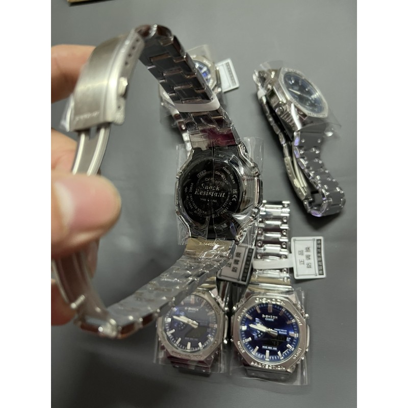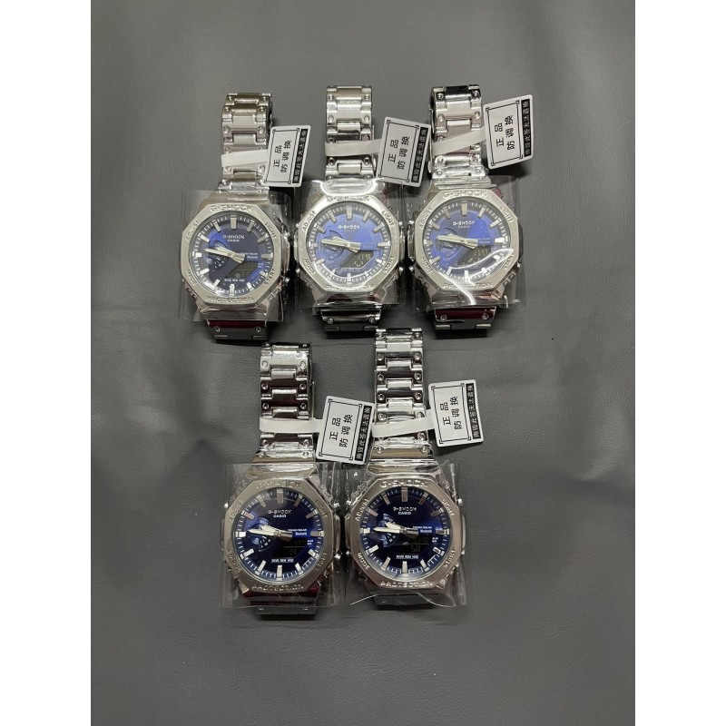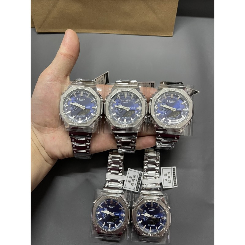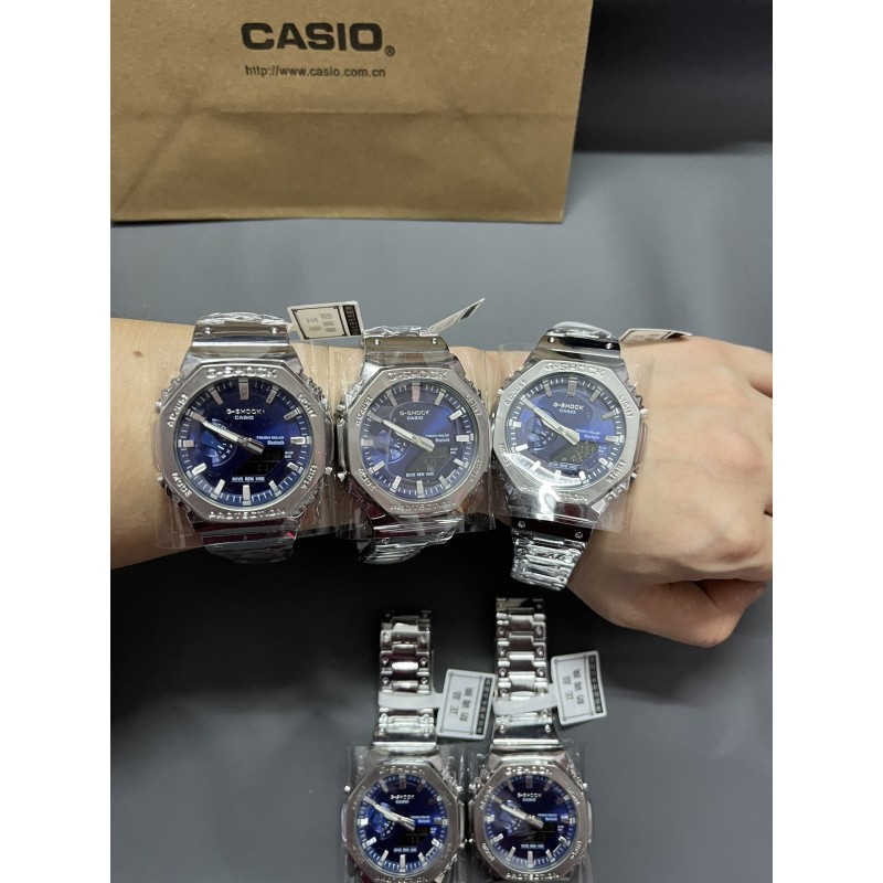 金属八角冰蓝精灵钢带系列 型号GM-B2100 功能:太阳能,秒表(精确到1/1000秒)世界时间,倒计时,闹铃,间歇响报,自动日历,45度自动抬手亮Led照明! 不锈钢表扣、全钢表带、不锈钢表壳、矿物质玻璃、不锈钢后盖、完美的刻度、原装日本机芯、机芯带双重显示~指针显示~屏幕显示、表针细磨、采用进口太阳能液晶屏、进口LED灯!