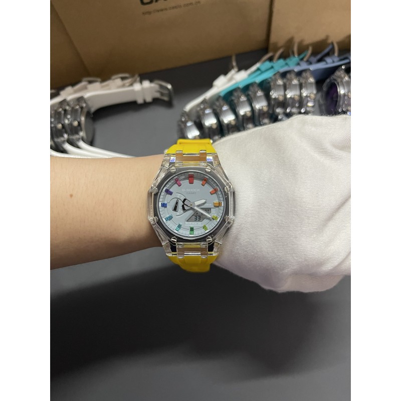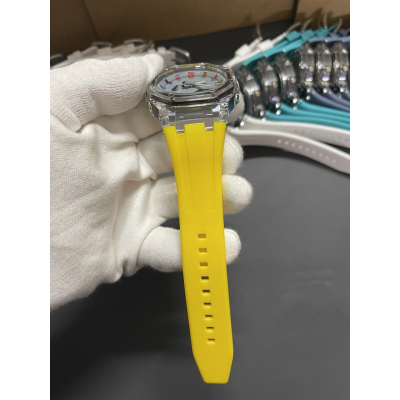 农家橡树透明冰川限量 型号:GM-2100A 功能:太阳能、秒表(精确到1/1000秒)世界时间,倒计时,闹铃,间歇响报,自动日历,45度自动抬手亮Led照明! 不锈钢表扣、橡胶表带、硬橡胶表壳、矿物质玻璃、不锈钢后盖、完美的刻度、原装机芯、机芯带双重显示~指针显示~屏幕显示、表针细磨、采用进口液晶屏、进口LED灯!