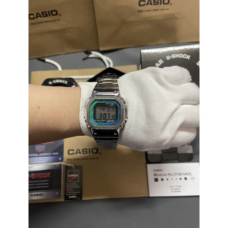 新款炫彩渐变冰蓝精灵钢带系列 型号:GMW-B5000 功能:太阳能,秒表(精确到1/1000秒)世界时间,倒计时,闹铃,间歇响报,自动日历,45度自动抬手亮Led照明!