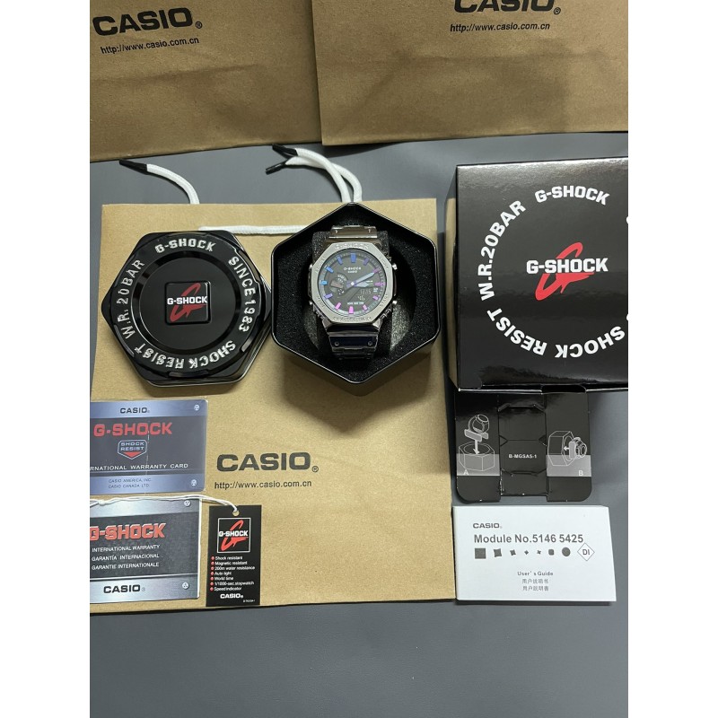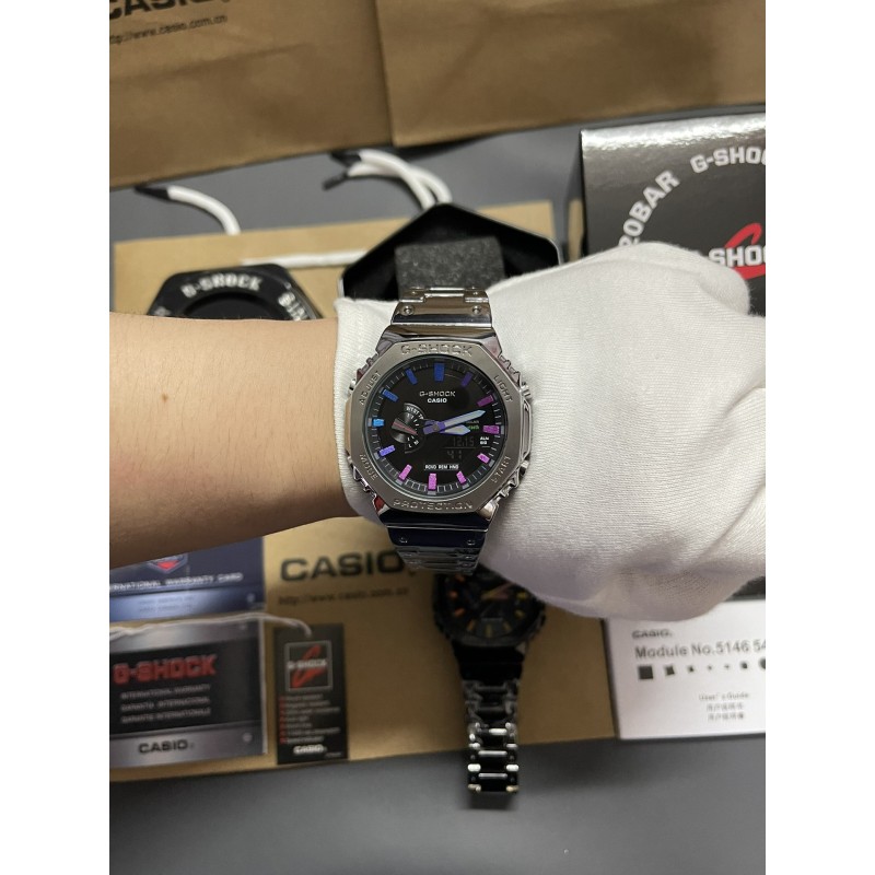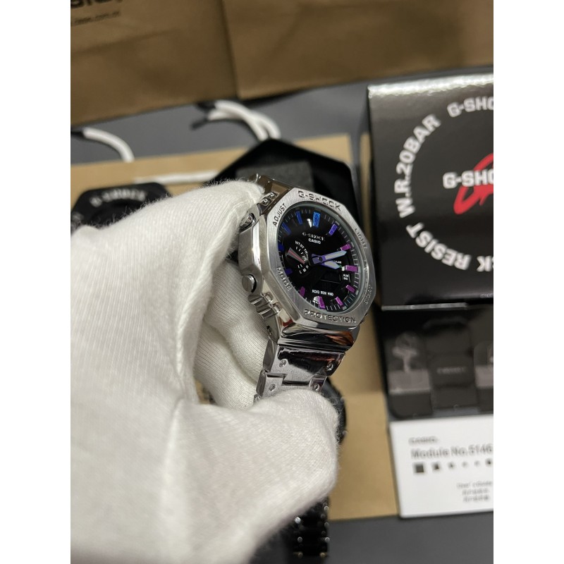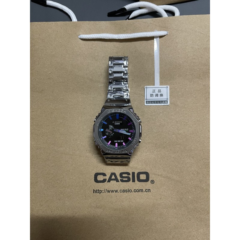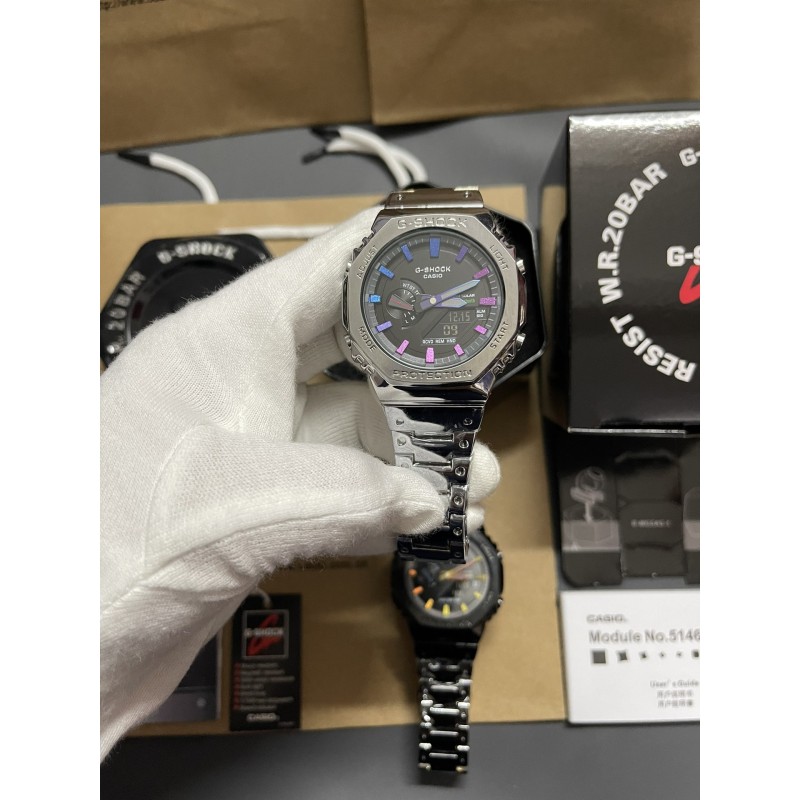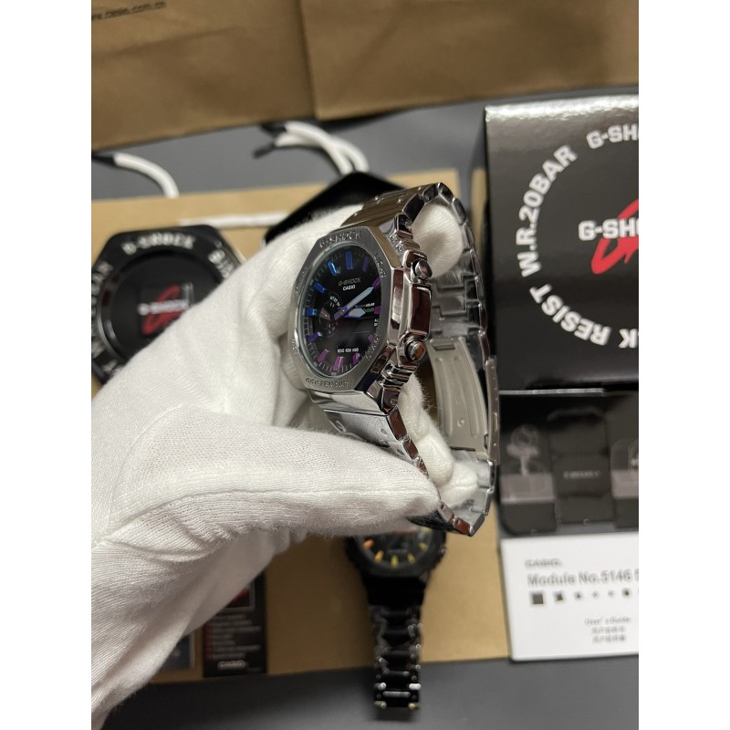 新款金属八角冰蓝精灵钢带系列 型号GM-B2100 功能:太阳能,秒表(精确到1/1000秒)世界时间,倒计时,闹铃,间歇响报,自动日历,45度自动抬手亮Led照明!
