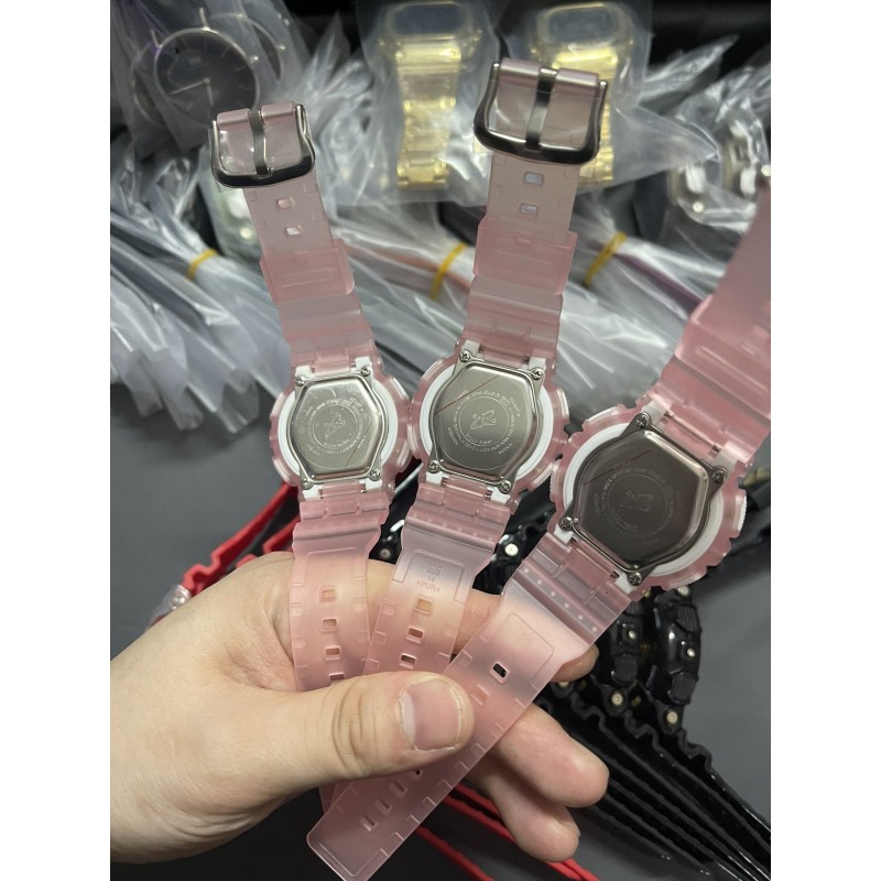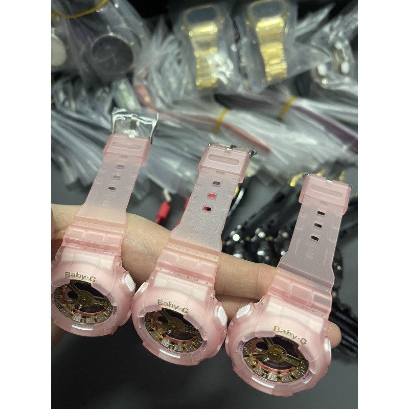 新款BABY-G海玻璃透明粉限量款 型号:BA~110 功能:秒表(精确到1/1000秒)世界时间,倒计时,闹铃,间歇响报,自动日历,45度自动抬手亮Led照明!