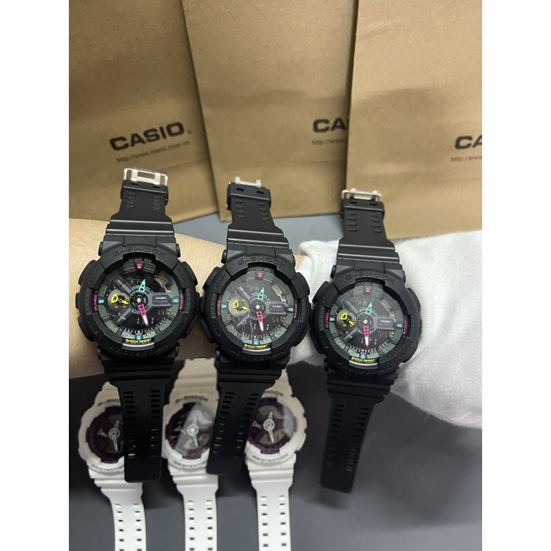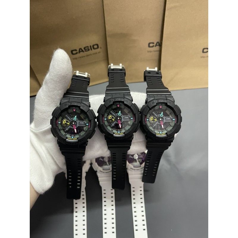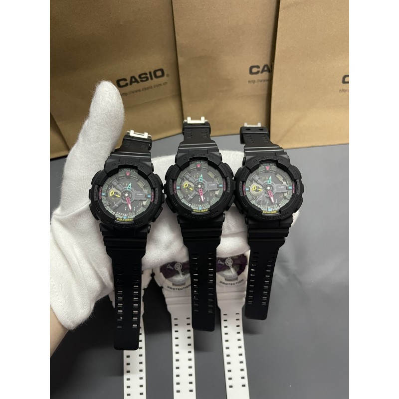 炫彩璀璨联名限量款 型号:GA~110 功能:秒表(精确到1/1000秒)世界时间,倒计时,闹铃,间歇响报,自动日历,45度自动抬手亮Led照明! 不锈钢表扣、橡胶表带、硬橡胶表壳、矿物质玻璃、不锈钢后盖、完美的刻度、原装机芯、机芯带双重显示~指针显示~屏幕显示、表针细磨、采用进口液晶屏、进口LED灯!