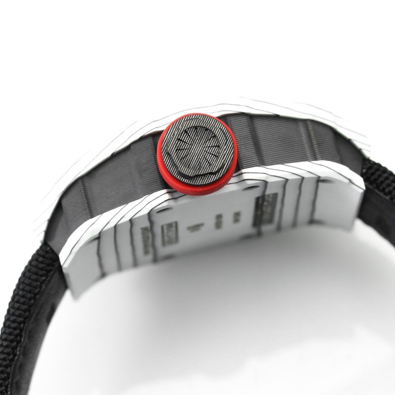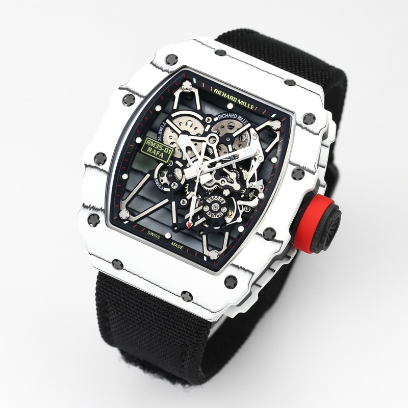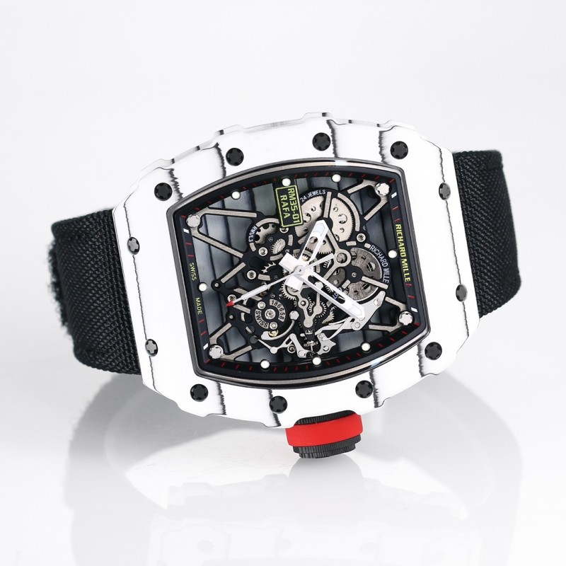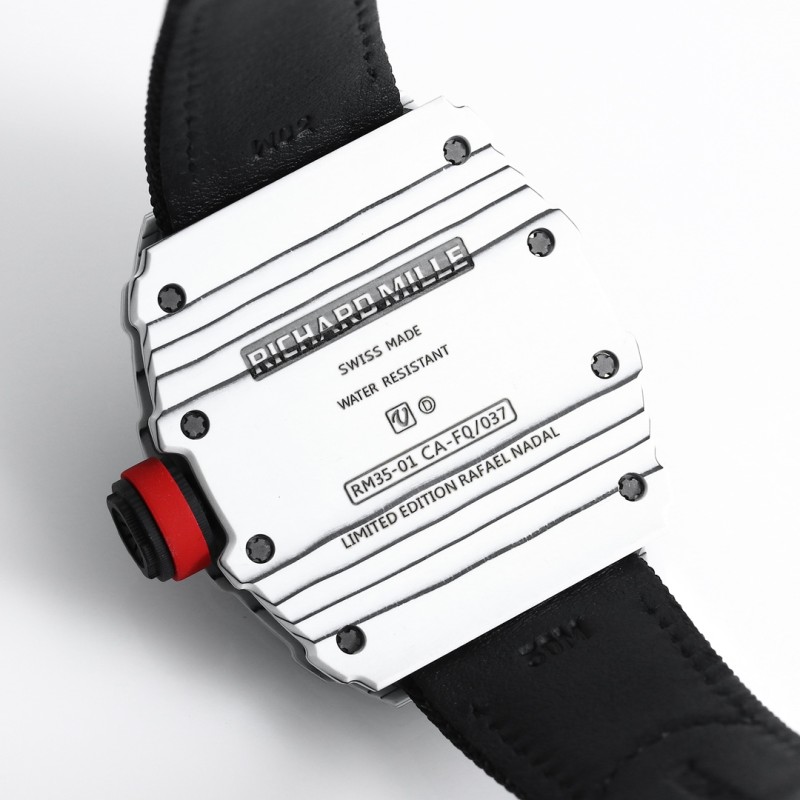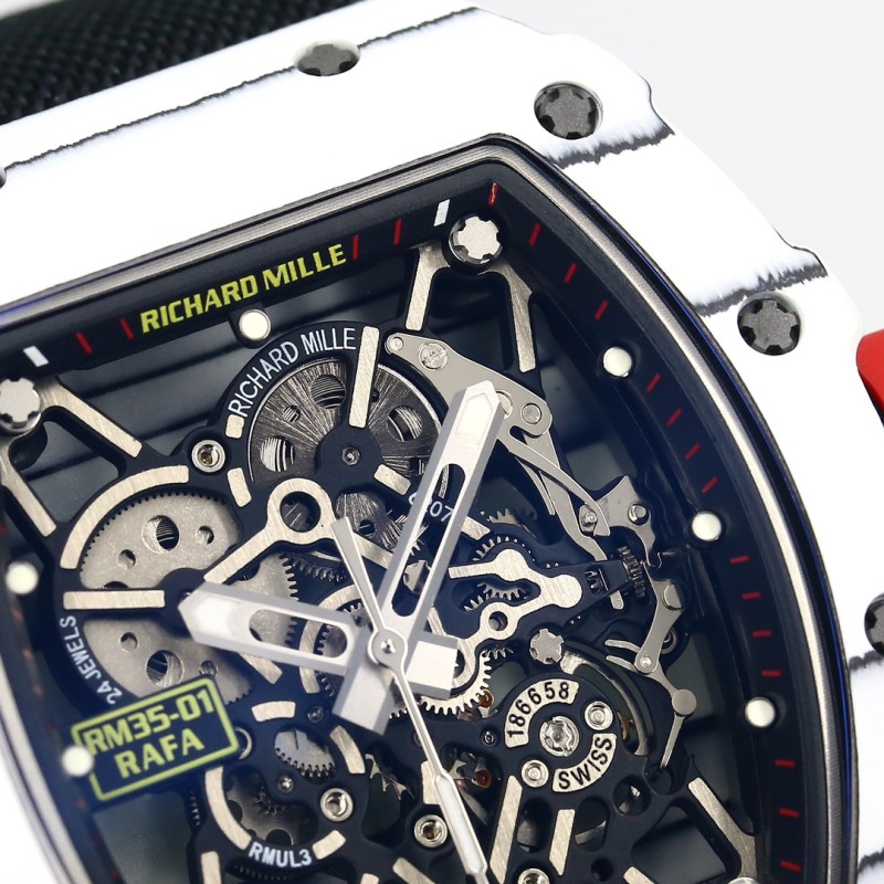 『新厂-NEW Factory』【天花板】RICHARD MILLE理查德米勒RM 35-01 RAFAEL NADAL碳纤维腕表——作为亿万富豪的入场劵 1机芯:目前市场最高版本机芯,独家研发原装RMUL3镂空一体机芯、白宝石避震器、经过长期测试,稳定性相当高,机芯打磨到位,(原装同步) 2表壳:进口NTPT 原装纹路碳纤维打造、轻量 级表款,克重仅 50g、内胆与表盖钢件采用钛 合金材料、CNC 高精密加工、使表壳配合完美 无缝隙!真正做到原装正品细节。 3表盘:镂空表盘搭配经典黑红赛道内影展现腕 表独有魅力 4:表镜:采用高弧度蓝宝石镜面双,并采用双面电镀高透膜,具有防眩效果,清晰而精致。 5:表带:天然橡胶表带与编制魔术贴表带选 择、 6:表扣:钛合金折叠表扣,原装开模,刻字清晰立体,完美还原正品形状,弹簧片同样采用钛金属,弹性效果更好更持久 7:螺丝:全部采用钛金属电镀深灰色工艺,同步原装效果 『新厂-NEW Factory』实现新突破,用“心”对待腕表爱好者!
