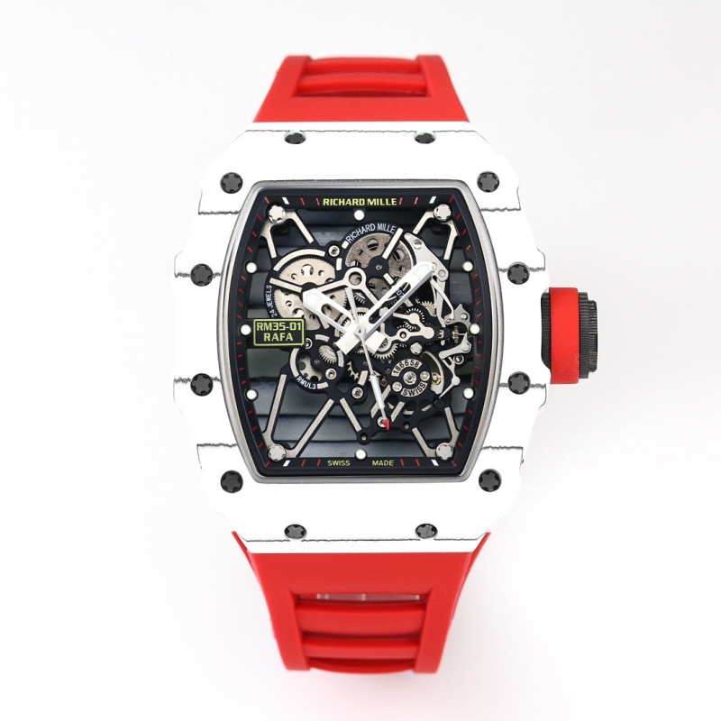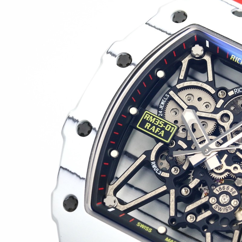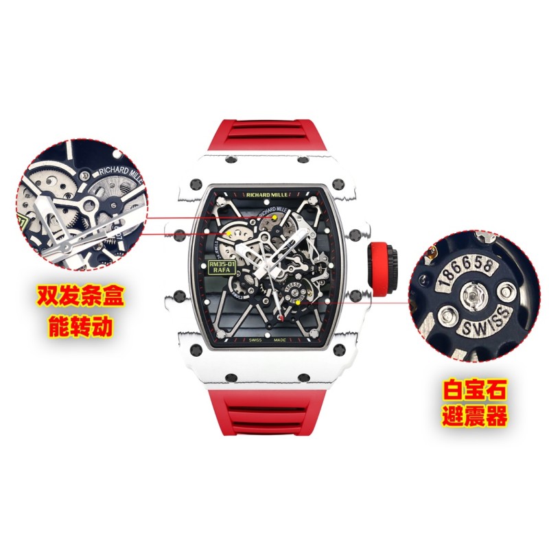 『新厂-NEW Factory』【天花板】RICHARD MILLE理查德米勒RM 35-01 RAFAEL NADAL碳纤维腕表——作为亿万富豪的入场劵 1机芯:目前市场最高版本机芯,独家研发原装RMUL3镂空一体机芯、白宝石避震器、经过长期测试,稳定性相当高,机芯打磨到位,(原装同步) 2表壳:进口NTPT 原装纹路碳纤维打造、轻量 级表款,克重仅 50g、内胆与表盖钢件采用钛 合金材料、CNC 高精密加工、使表壳配合完美 无缝隙!真正做到原装正品细节。 3表盘:镂空表盘搭配经典黑红赛道内影展现腕 表独有魅力 4:表镜:采用高弧度蓝宝石镜面双,并采用双面电镀高透膜,具有防眩效果,清晰而精致。 5:表带:天然橡胶表带与编制魔术贴表带选 择、 6:表扣:钛合金折叠表扣,原装开模,刻字清晰立体,完美还原正品形状,弹簧片同样采用钛金属,弹性效果更好更持久 7:螺丝:全部采用钛金属电镀深灰色工艺,同步原装效果 『新厂-NEW Factory』实现新突破,用“心”对待腕表爱好者!