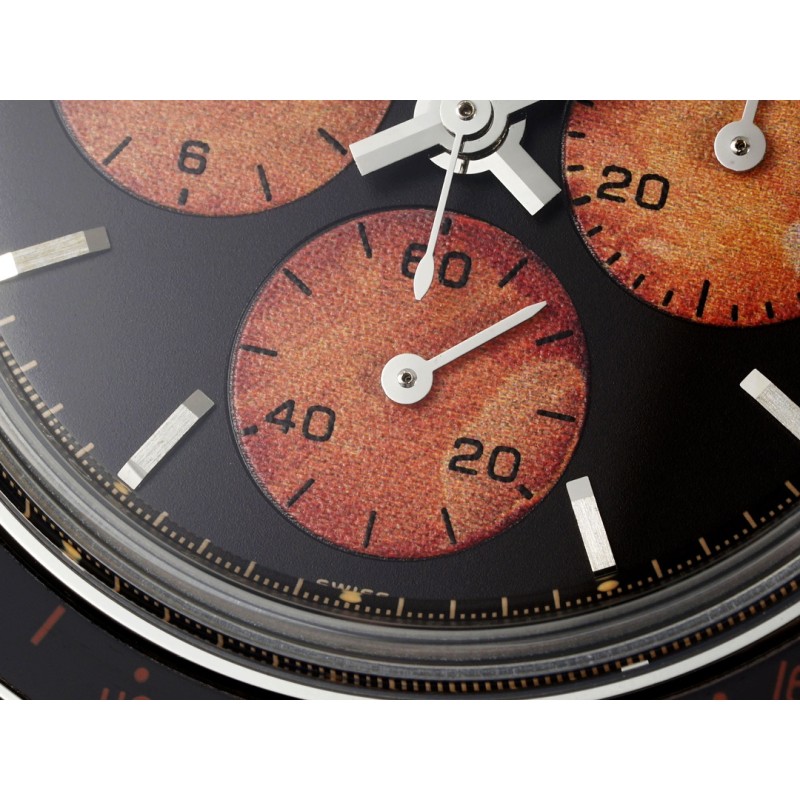 日内瓦工匠Artisans de Genève (简称:ADG)推出极上优雅 Rolex Daytona 定制计时码表,改装工匠首先采用传统方式对黄金表壳和表链进行打磨修饰,同时移除了表冠两侧的保护装置,平面玻璃亦被拆除,取而代之的是弧面蓝宝石玻璃表镜,营造充满怀旧气息的外观,重新设计 Daytona 表盘,涂上色漆并以日晖纹装饰,原本的金属表圈也被蓝宝石表圈取代,绿与金的色彩交融散发出温暖的气息。Rolex 4130 机芯同样改头换面,得益于蓝宝石水晶表底,佩戴者可以直接欣赏到机芯的精饰,日内瓦波纹、手工倒角,以及新的K金上链摆陀。