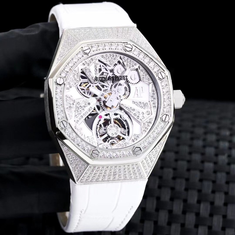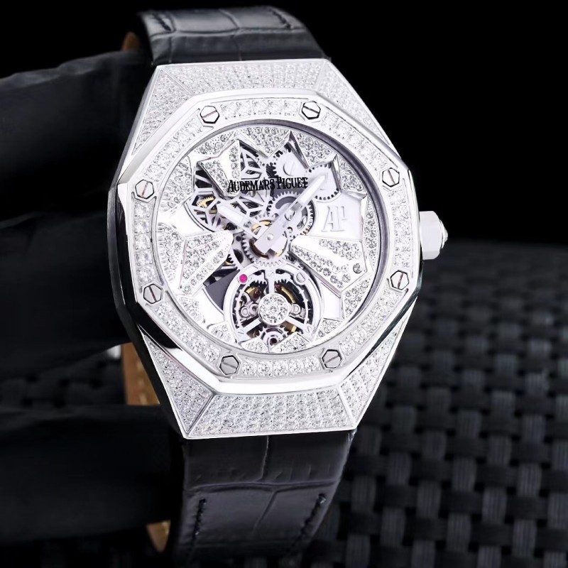 Audemars Piguet Royal Oak Concept 爱彼表,皇家橡树概念系列,高级制表与珠宝工艺和谐共存,镶嵌明亮式切割美钻或阶梯型切割钻石,搭配复杂机制的独特设计,营造出如同悬浮的视觉效果,隐密式镶嵌技术令阶梯型切割钻石的满天星腕表愈发耀眼夺目。直径42mm,全自动机械。奢华闪耀,美轮美奂,熠熠生辉。
