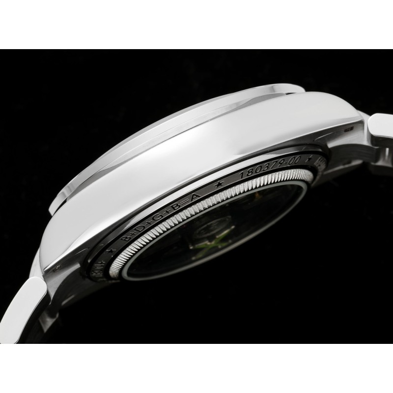 新作日内瓦工匠Artisans de Genève (简称:ADG)打造全新迪通拿(黑暗中的微光) 1、表盘由一整块天然蓝宝石制成,从复古时计中汲取灵感。其透明度提供了迷人的视野,揭示了制表工艺的复杂性。该作品覆盖有发光板,可发出始终存在的光芒。定制特色自动陀添加了手工涂有夜光材料的磷光 “X ”嵌件。 2、夜光材料凸显了每一个细节——表圈生动、独特的色调与光滑表面的魅力相映成趣。Super-Luminova 指针在表盘上带有 12 个霓虹灯参考点,营造出迷人的视觉张力。表圈采用孤形蓝宝石,辅以新开发的霓虹绿发光嵌件,唤起了过去时代的魅力。 3、蓝宝石水晶下方是cal.4130 镂空机芯。通过表盘上的镂空小表盘可以观察到机芯的各个部分,而透明表背则提供了全景。自动陀上还添加了特制的 “X ”形磷光嵌件,以配合整体主题。蓝宝石表盘和镂空机芯让光线穿透亚当个性化的每一个部分。