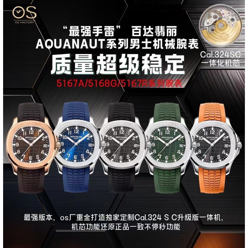 OS厂 V2版/OSFactory“最强手雷” 百达翡丽AQUANAUT系列男士机械腕表,5167A/5168G/5167R系列腕表——OS厂独家开发定制百达翡丽PATEK PHILIPPE Cal.324SC一体机芯,升级改善市场版本的不足,机芯功能储蓄长达45小时左右。品质极其稳定,产品以手雷形状大胆的设计,展现腕间时计的动感时尚魅力,也彰显了男士向往远方的探索精神,又不失典雅精致,凸显百达翡丽运动腕表的气质。
