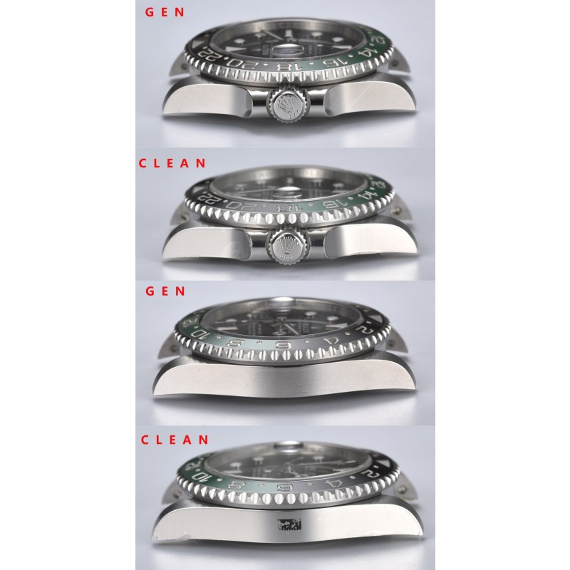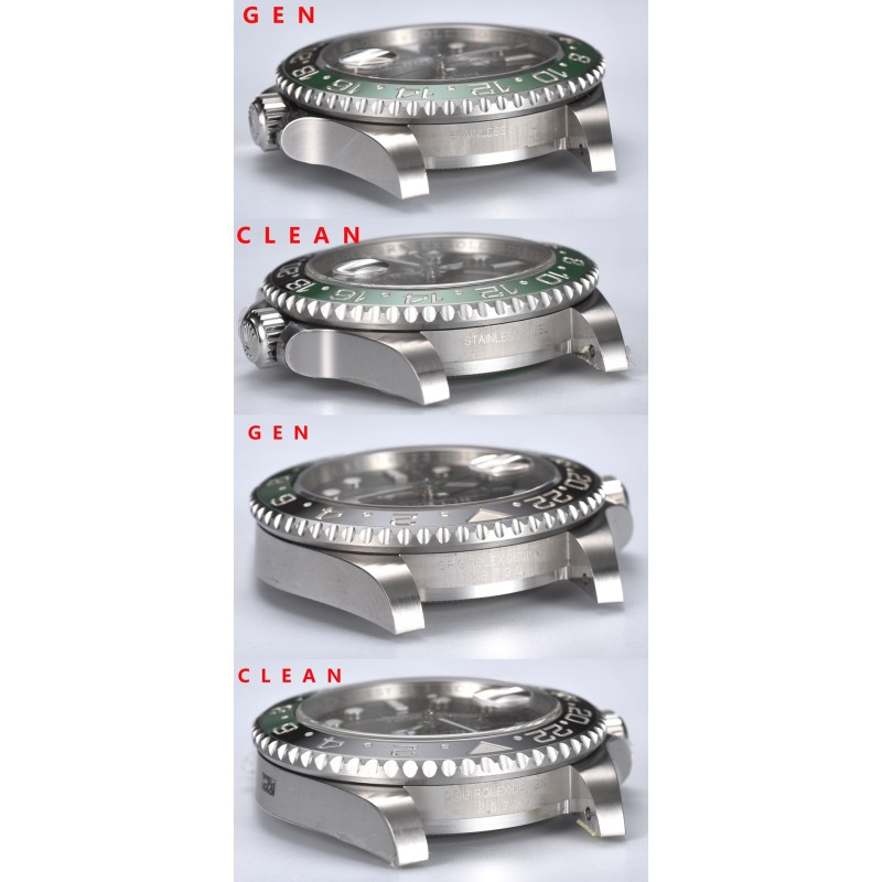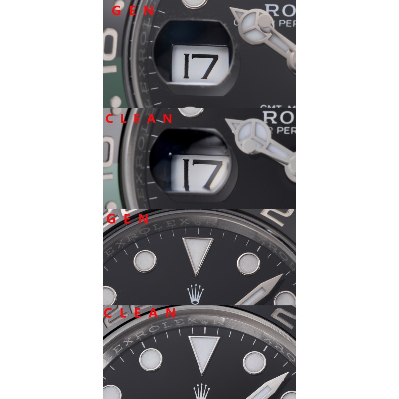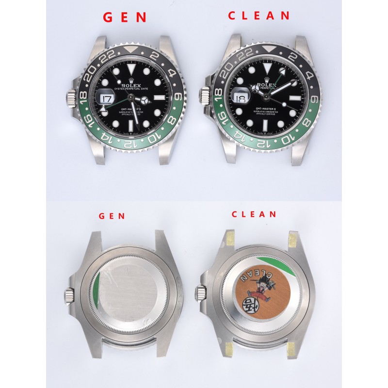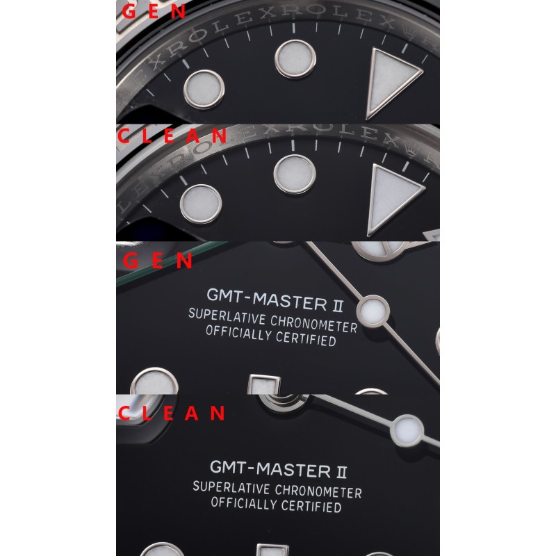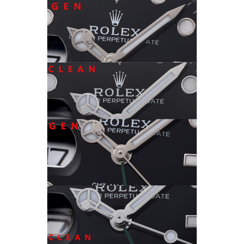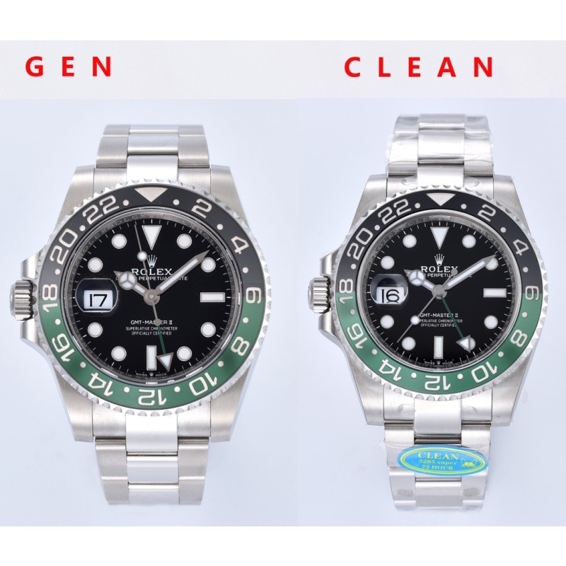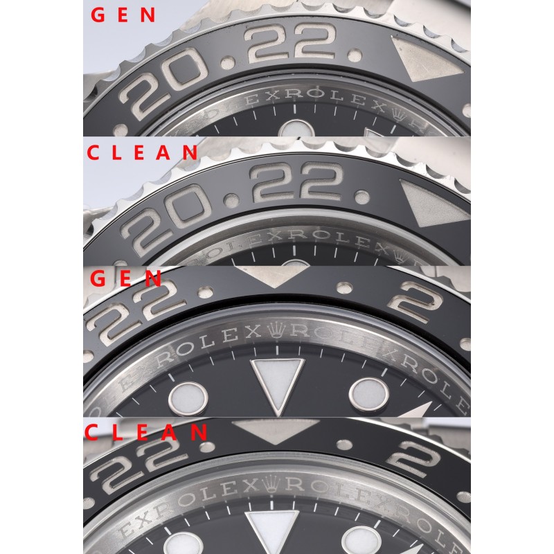 c厂gmt雪碧126720对比 雪碧圈即126720左撇子版本的gmt毋庸置疑是劳力士,它的前身可以追溯到劳力士1950年中期6542左撇子版本,以及1675也有左撇子版本,但是数量非常稀少。但是和新款雪碧圈不同的是,只有雪碧圈,日历窗和把头都变成了9点位置,其他的老款日历依旧再正常的3点位,只是变换了把头位置,至于美丑,各花入各眼吧。 本次采用的依旧是丹东3285机芯,稳定性 动力存储自然不用过多赘述。 图片山不难看出,雪碧圈的难点在于陶瓷圈上的黑色与绿色的拼接过渡效果,以及绿色部分的色差问题,因为clean有了最早开发绿水鬼圈口的经验,所以再这次的雪碧圈中,自然也是信手拈来,绿色部分几乎无色差,黑绿衔接部分,也有了真品一般沁色的效果。 表壳表带以及表盘可以通过图片看到做工也是非常的好。Clean对于这些细节上有这非常严格的把控。 重点!!!Clean在2022年末升级了所有款式的的表扣上的小皇冠,皇冠底部为抛光,并且皇冠的表面依旧保持平整,这个在整个行业都属于先驱之举,制作工艺也是相当复杂,后面会放上对比图。这种细枝末节的部分。Clean一直都是极致的追求。