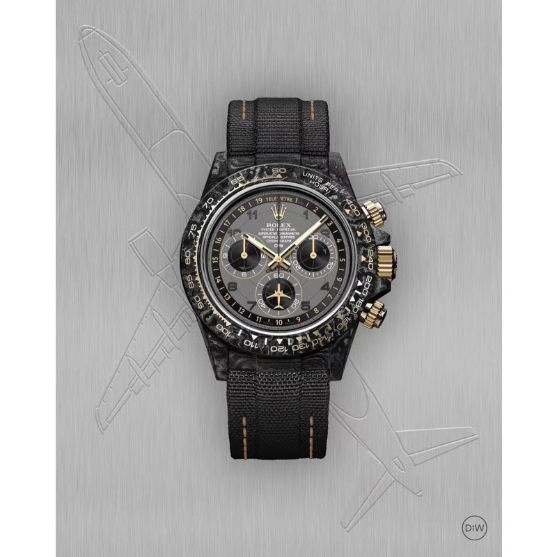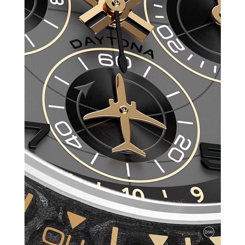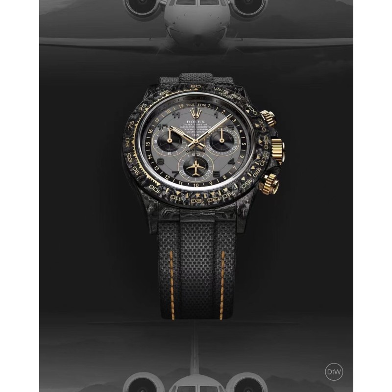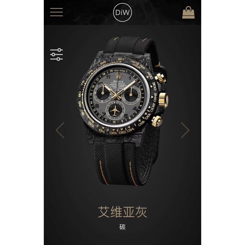 Diw 劳力士碳纤维迪通拿 更新了4款颜色 分别为: 1、沙漠之鹰阿拉伯语(Desert Eagle Arabic):灵感来自沙漠的美丽色彩,阿拉伯刻度和深棕色搭配能让你身临其境到沙漠里。 2、黄金精华(Golden Essence):香槟金色表盘搭配黄金色圈口和白石英纤维壳身。 3、艾维亚灰(Avia Grey):以灰色表盘为主题 比较有意思的是表盘还配有1-19测距仪刻度,此款最大亮点在于6字位秒针会一直转,这是一个新的创新尝试。 4、奶油反转金(Cream Invert Gold):西装暴徒定制款,黑色表盘配香槟金色外圈刻度,凸显简约高贵。