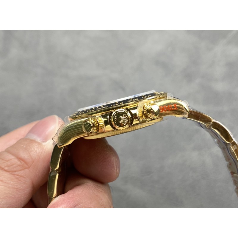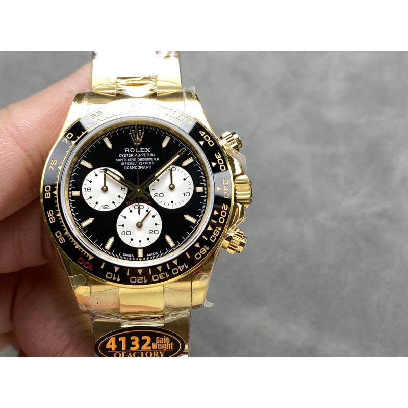 QF 配重4132 劳力士 加重175g迪通拿透底4132 官方定制款勒芒24小时耐力赛100周年,劳力士全新发布了一款宇宙计型迪通拿,黑色陶瓷字圈上数宇“100”用醒目的红色标示,以此纪念赛事的100 周年。经典的保罗纽曼盘面搭配 蚝式表带,此次腕表同样采用背透设计,背部机芯清晰可见。4132机芯40mm