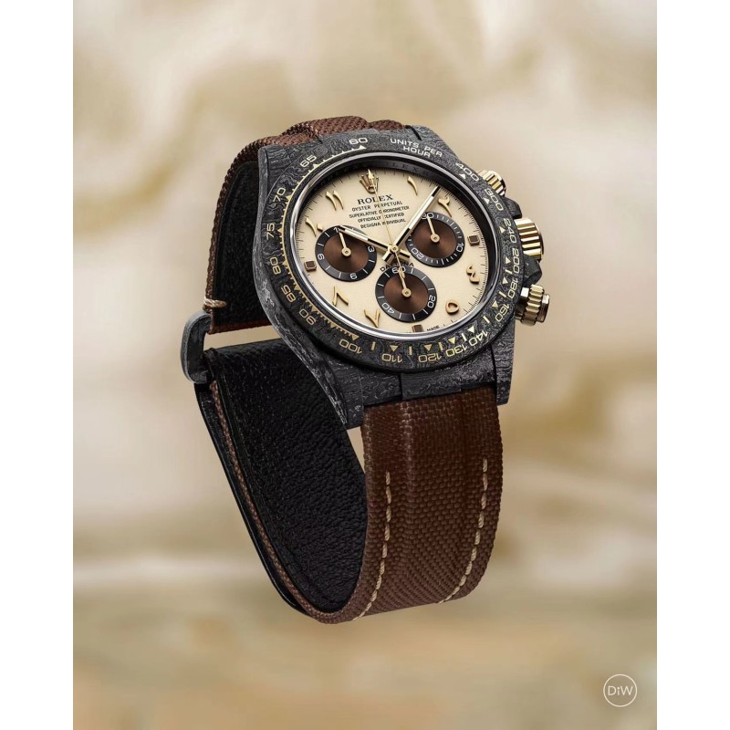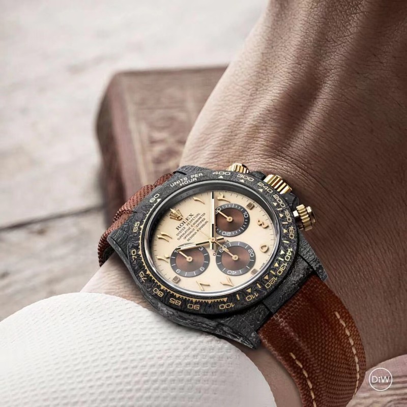 Diw 劳力士碳纤维迪通拿 更新了4款颜色 分别为: 1、沙漠之鹰阿拉伯语(Desert Eagle Arabic):灵感来自沙漠的美丽色彩,阿拉伯刻度和深棕色搭配能让你身临其境到沙漠里。 2、黄金精华(Golden Essence):香槟金色表盘搭配黄金色圈口和白石英纤维壳身。 3、艾维亚灰(Avia Grey):以灰色表盘为主题 比较有意思的是表盘还配有1-19测距仪刻度,此款最大亮点在于6字位秒针会一直转,这是一个新的创新尝试。 4、奶油反转金(Cream Invert Gold):西装暴徒定制款,黑色表盘配香槟金色外圈刻度,凸显简约高贵。