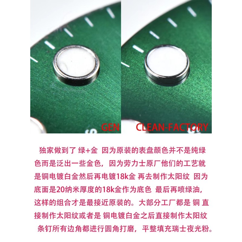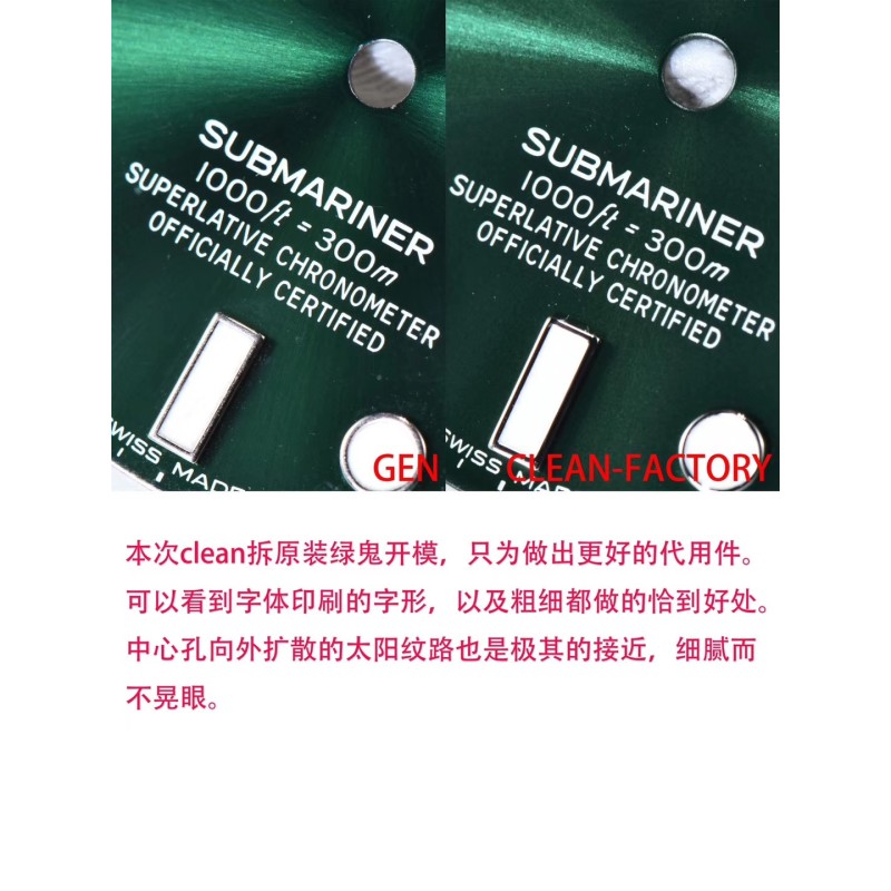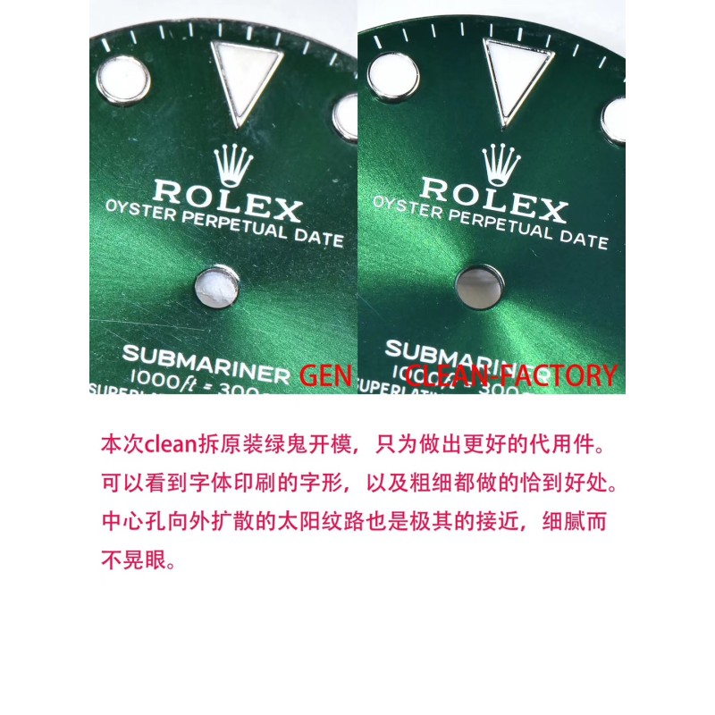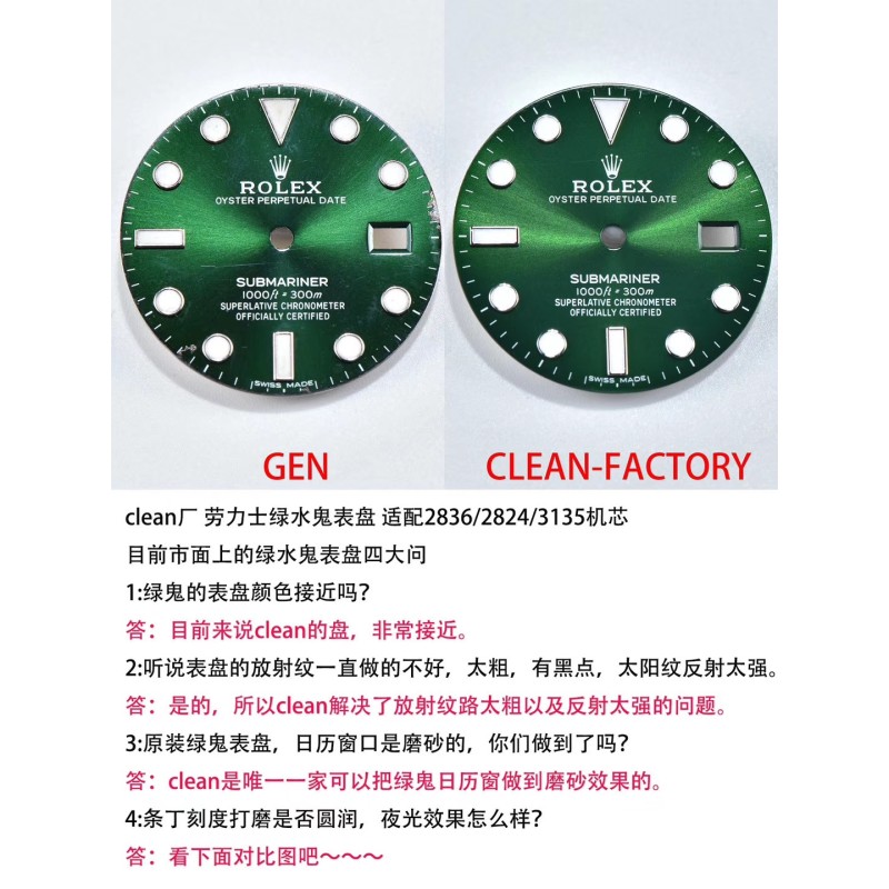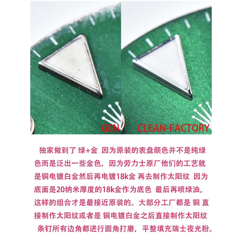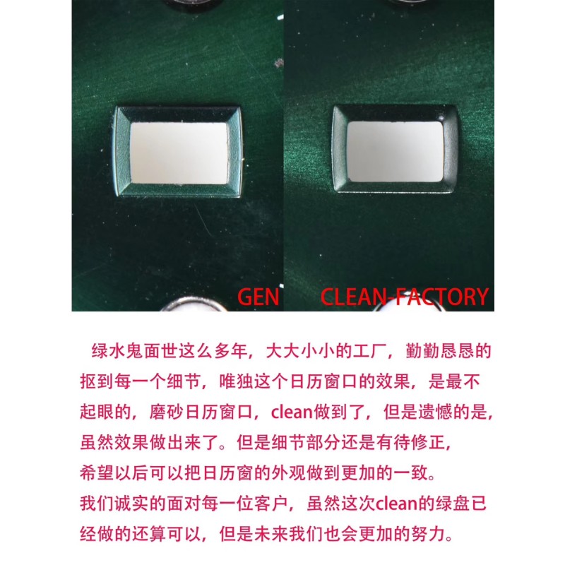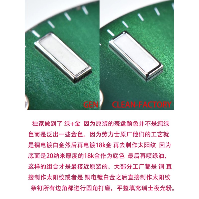 CLEAN厂40mm水鬼116610系列 全线v5版本 升级点 1.全线更换丹东3135机芯 机芯打磨升级 机芯结构更加接近原装 2.外圈转动手感不再生涩 3.玻璃白边修正 4.日历字体修正,杜绝毛刺,杜绝日历底色有喷墨迹象 5.表带倒角打磨更加圆润 6.表扣/千秋架开合力度 都能达到"电吸门"现货,如丝般顺滑 真正的clean v4最新版本绿色圈口,秒杀原有的v3版绿圈 独家clean版本蓝圈/同原装一致呈现蓝紫色 手工打磨立体指针/不用再更换代用指针了。 黑绿/钢色水鬼,沿用AR钢带。 clean间金钢带/AR钢带(独家三段拼接头粒+侧面不漏钢) Clean顶级代用绿色表盘 clean自主研发蓝色表盘 全904L材料(真18k真空电镀,脱色免费更换) 本次发布的款式共有五款 116610(黑/绿)纯钢壳水鬼 114060(黑)无日历水鬼 116613(黑/蓝)间金水鬼 或许你得到的,远比你想象中多的多... 敬请期待,C厂与您