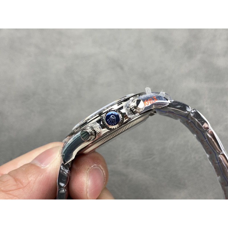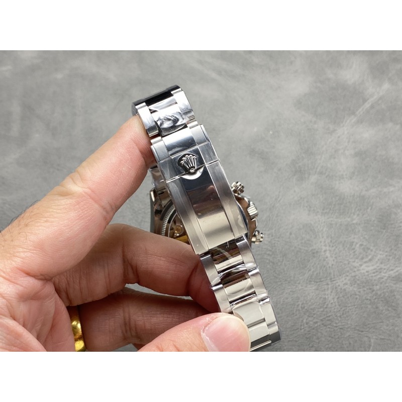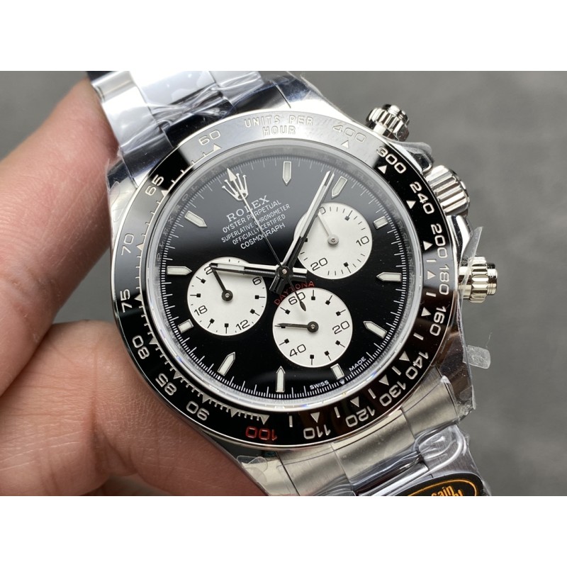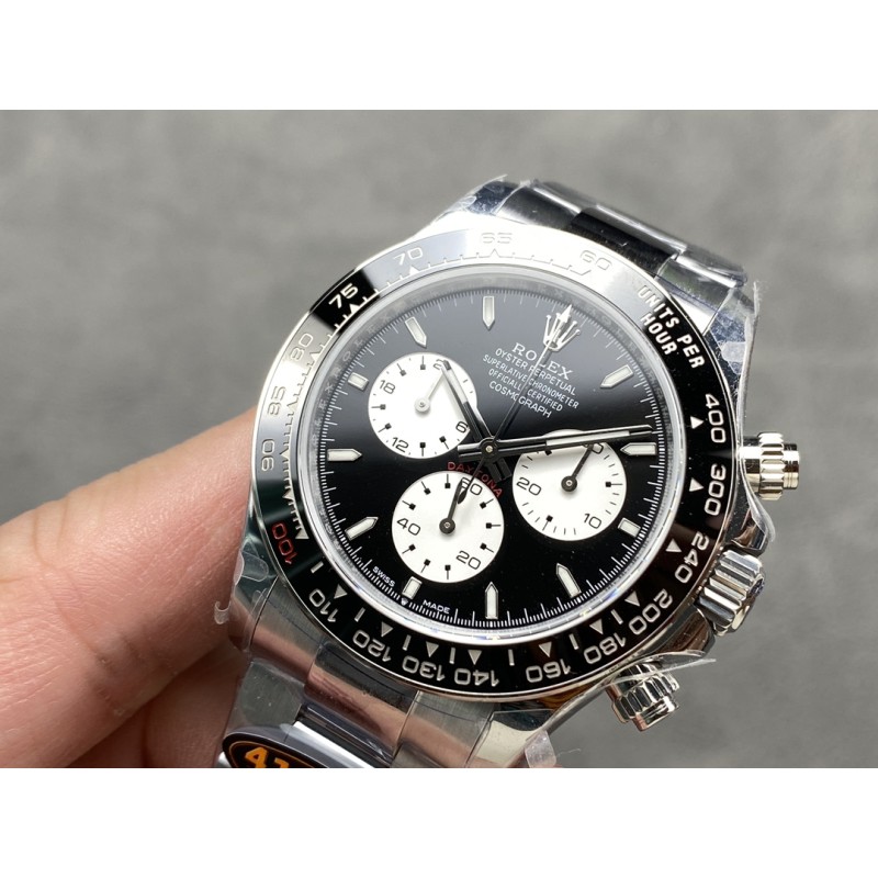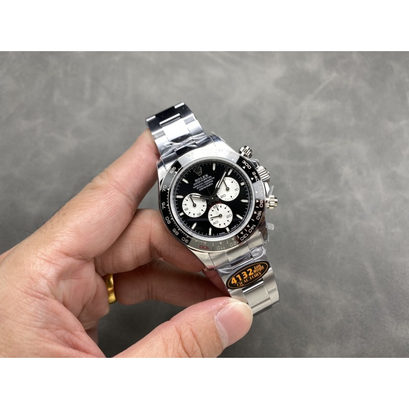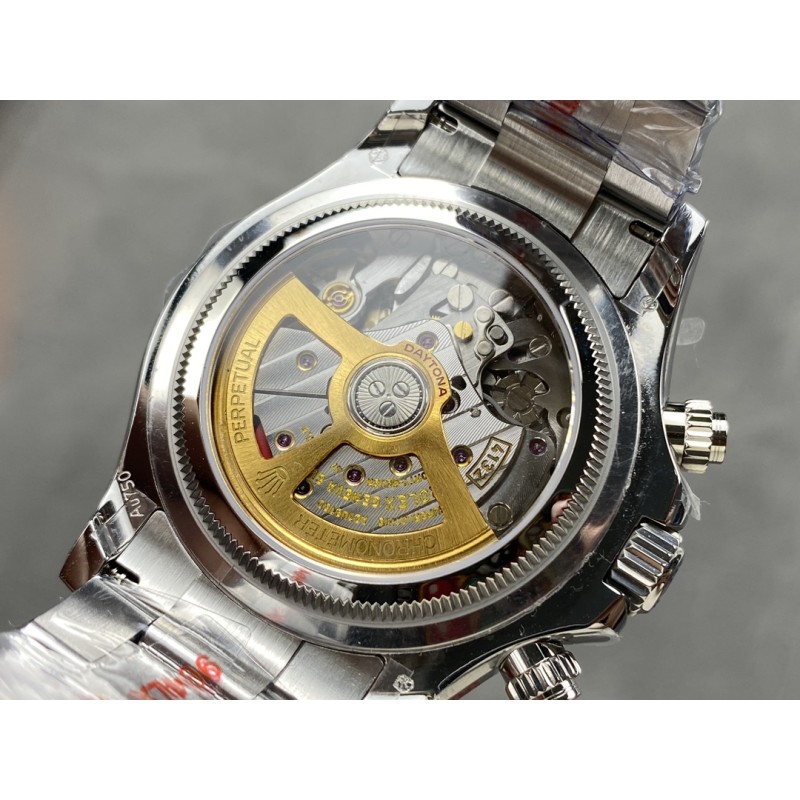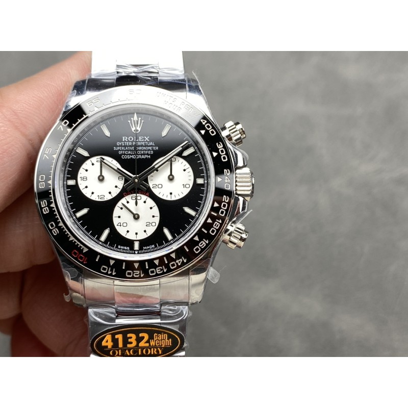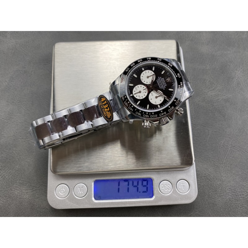QF 配重4132 劳力士 加重175g迪通拿透底4132 官方定制款勒芒24小时耐力赛100周年,劳力士全新发布了一款宇宙计型迪通拿,黑色陶瓷字圈上数宇“100”用醒目的红色标示,以此纪念赛事的100 周年。经典的保罗纽曼盘面搭配 蚝式表带,此次腕表同样采用背透设计,背部机芯清晰可见。4132机芯40mm