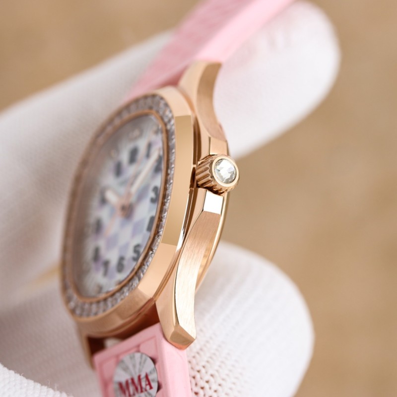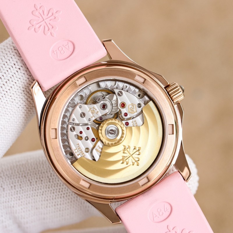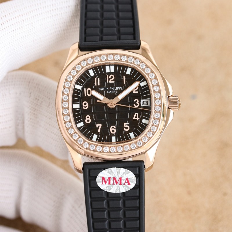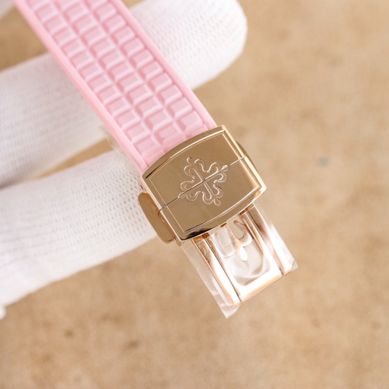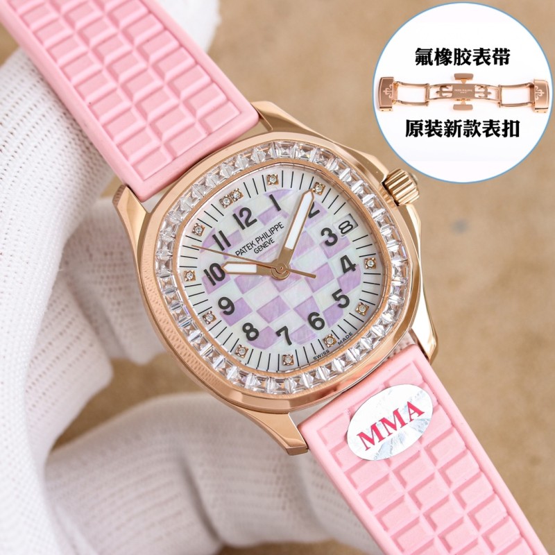 白壳1300 玫金1350(贝壳面贵50)满钻100 MMA新款出品 8.6mm 超薄机械手雷女款 PP 百达翡丽 AQUANAUT系列机械女 手雷 横空出世,告别机芯一眼假时代。OT3 表壳:35.6mm的表径,厚度8.6mm ,完美还原官方尺寸精钢打造的表壳,整一个表壳通过全程CNC打磨而成,诠释了何为精雕细琢。表壳圈口部位镶嵌一圈施华洛世奇钻石尽显精致美感,大大提升佩戴者的贵族气质。 表盘:材质为天然彩贝,立体的手雷纹路与规则的浮雕表盘相互呼应,12个独立开模的阿拉伯数字刻度立体感满满,搭配起来更显活泼时尚,通过上方的蓝宝石水晶玻璃往下看,呈现出一种流畅与协调之美。 表带:手雷独配的橡胶表带,凸显出它的运动性和时尚感,采用表盘一样的网格设计,不同的方法却依旧使整表混为一体,有着异曲同工之妙。搭配经典的折叠按扣,表扣边缘的打磨十分到位,打开扣子可以看到内扣雕刻有百达翡丽的英文字母,刻字大小一致,通过放大镜去看依然非常清晰,完全遵从了原装的工艺。 机芯:透底设计的底盖,通过高清蓝宝石水晶玻璃镜面,可以很清晰的看到整体的机芯构造以及运转,本厂采用了独家定制的Cal.324机芯,完整的还原了原装机芯的每一个细节,中轴左右两侧的两个大小齿轮同样完美的还原请认准MMA独家品质