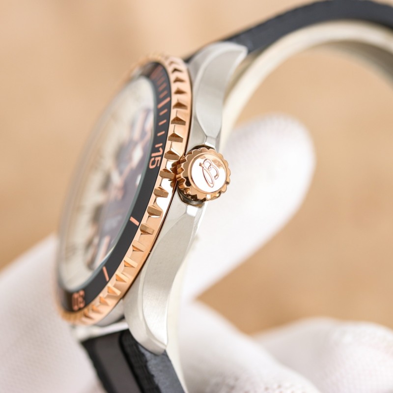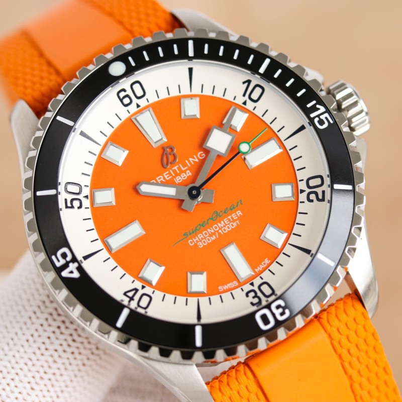 统一1650 GR出品百年灵超级海洋系列42mm腕表。 1:潜水表既要满足清读时,更要操作便捷。此款时标和指针大限度的夜光涂层,保证在昏暗的深海能清晰读时,如在黑暗中的小灯泡一样;便捷则离不开带坑纹的陶瓷表圈、微拉扣的折叠表扣;配搭精准机械机芯与耐磨的双球形蓝宝石玻璃。 2 几何指针,清晰更有型。此款腕表的指针将几何魅力挥洒到极致,新奇而和谐的组合,不但读时清晰,更一见难忘。 3:听声辨表,操作便捷。喜欢机械腕表的人,也多为上链时、旋转表圈时的声音着迷。听着那分明的节奏,手下似乎更能清晰地感受到各个部件在流畅运转。单向旋转表圈、旋入式表冠在细节上的处理使得佩戴者即使是长指甲也能轻松操作,并且每一次与腕表互动都听到那清脆悦耳的机械声。 4:选择众多,宜大胆尝试。超级海洋系列的表盘Logo、表圈刻度、时标等在配色和细节上都尽可能的纯粹,以凸显多彩的盘面颜色。多色陶瓷圈与多彩的盘面配搭,拥有更多样化的选择!