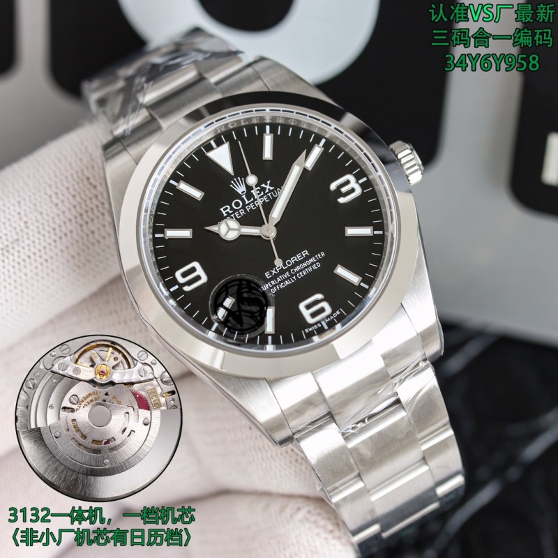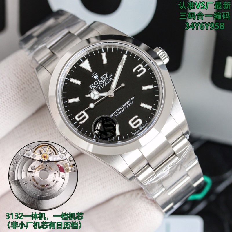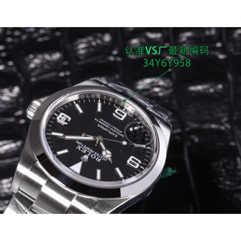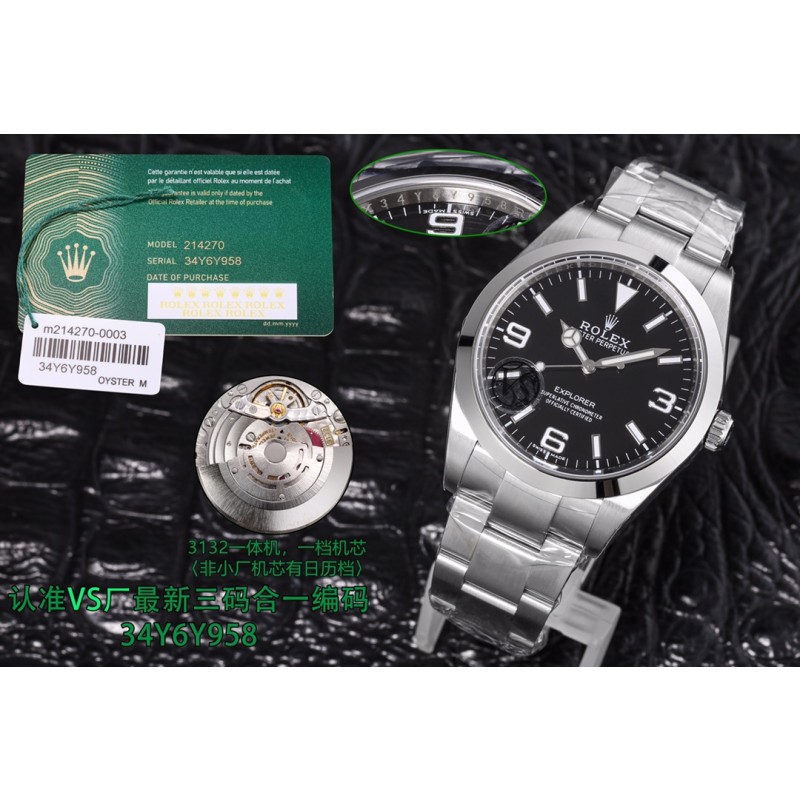 1850 VS探险家一214270,三码合一附带NFC感应卡 本次探险家,腕表编码34Y6Y958,腕表表扣编码, R3L。型号一214270 尺寸39mm 搭载3132一体机机芯机芯/,(非小厂低版本,机芯有日历档位,有空档)图片贴标错误 虽然这款并不是新款,在这之前也有不同工厂制作,但是都没有特别好的,甚至有部分细节可以说完全不对版。出于个人情怀,所以特别制作了这枚39mm 探险家。VS厂出品,必属精品,这款虽然是光圈板带,但是制作工艺也并不简单,特别是表盘上的数字刻度,形状要规整,整体打磨适中,以及填充夜光的难度。包括劳力士独有的奔驰潜水指针。可以说 探险家是蚝式恒动的进阶版。但是又没有水鬼的张扬。低调且内敛。是可玩性非常不错的一枚腕表。腕表编码,34Y6Y958,腕表表扣编码,R3L,三码合一定制美版,附带NFC,仿真度不言而喻。随后也会放出真假对比供玩家鉴赏。