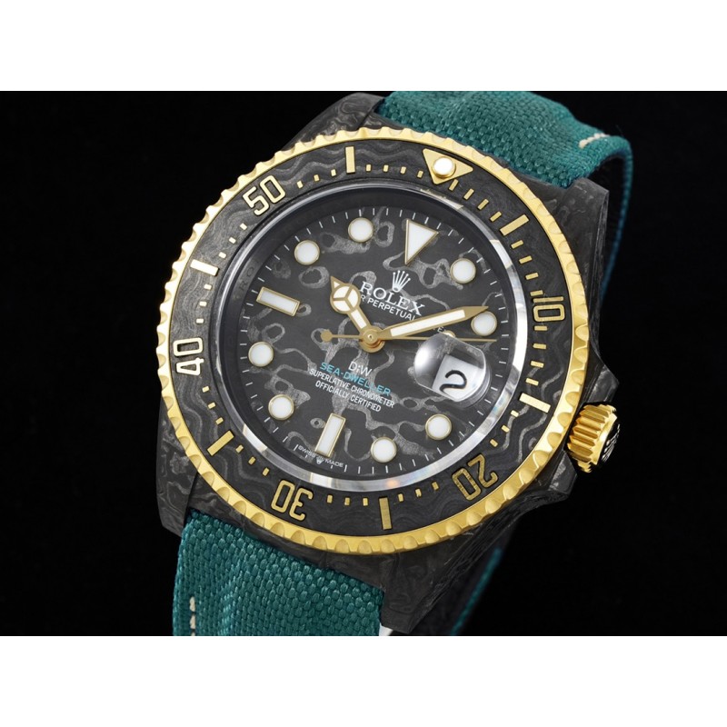DiW 梅开二度打造典藏款 Rolex Sea-Dweller 1、重新制作了43mm碳纤维表壳,包括表冠护肩也是用这种集科技感、轻量化与不规则特殊纹理的材质所制成。 2、碳纤维表圈刻度采用植钢钉技术,塑造视觉层次,手摸在上面有凹凸质感 3、采用全新定制型号:Cal.3235 机芯 动能储存≥80小时 4、设计符合人工体学的孤型锁螺丝魔术贴表带和一体碳纤维扣架,稳固同时也提升佩戴手感。
