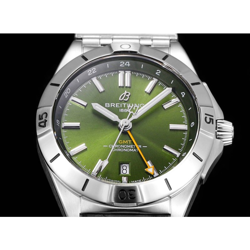统一1850 百年灵BREITLING,机械计时系列A32398101M1A1!(Chronomat Automatic GMT 40)重磅来袭! 1这款双时区腕表盘面简洁凌厉,读时清晰。黑色,蓝色,绿色,白色,烟煤灰,蓝间黄,冰蓝,蓝间蓝,九种盘面色彩选择,款款让人爱不释手! 2表壳采用精钢制成,配备带有双密封垫的旋入式表冠,优良防水性能。精钢表圈单向旋转,装饰标志性的15分钟“骑马钉”! 3钢带为备受关注的蝴蝶扣辊珠精钢表链因其类似“子弹”的外型被称为“子弹链”。 4表壳尺寸为40毫米,适合亚洲跟中国男士手腕! 5机芯采用etc.2836 GMT两地时!让需要国内外两地通用时间需求更加实用!做到两地不误! 虽然姗姗来迟,但诚意满满!匠心之作,你值得拥有