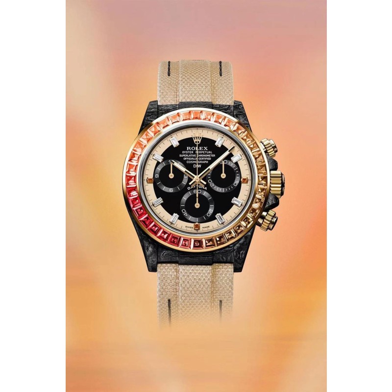 DiW 打造 Rolex Daytona 全新定定制款「Rainbow Sunray」阳光彩虹 以阳光为灵感的彩虹圈,整只表散发出和煦的金黄光芒,看起来既耀眼又温暖。在面盘设计部分,外围刻度环为米黄色,至于面盘内侧则是黑色,包括三枚小表盘的刻度环也都是黑色(但有做出太阳纹与纯粹黑色的面盘形成自然层次)。透底可见的4130机芯,更具有机械质感,并搭配了佩戴舒适的皮质内衬 NATO 规格尼龙表带。推出2款颜色可选,玫瑰金/黄金