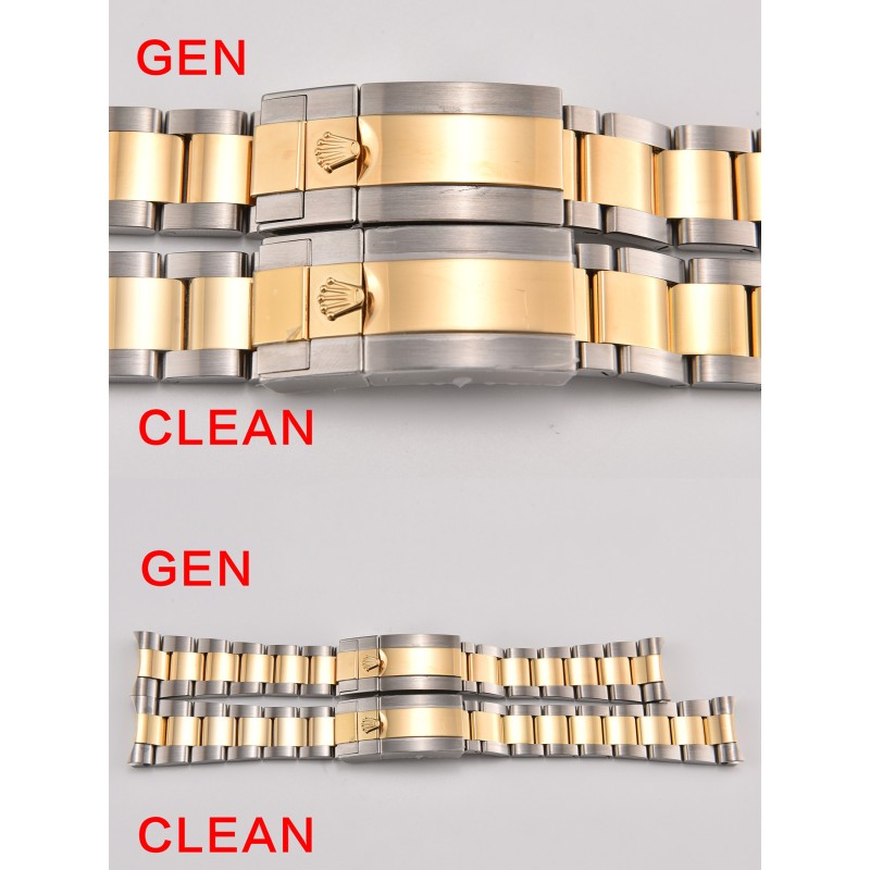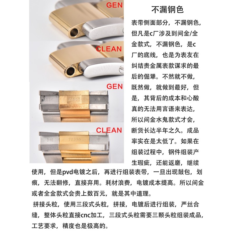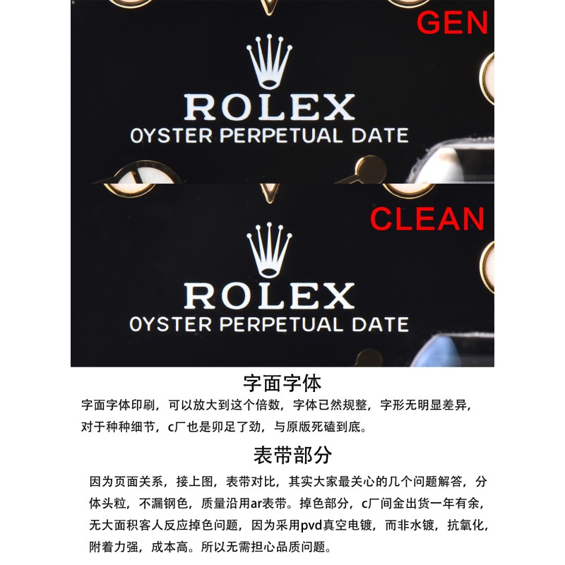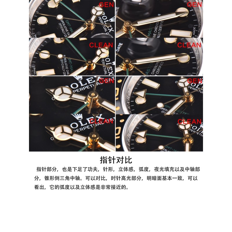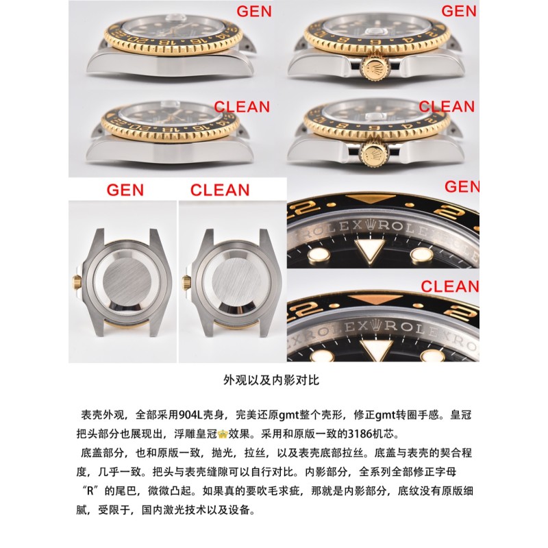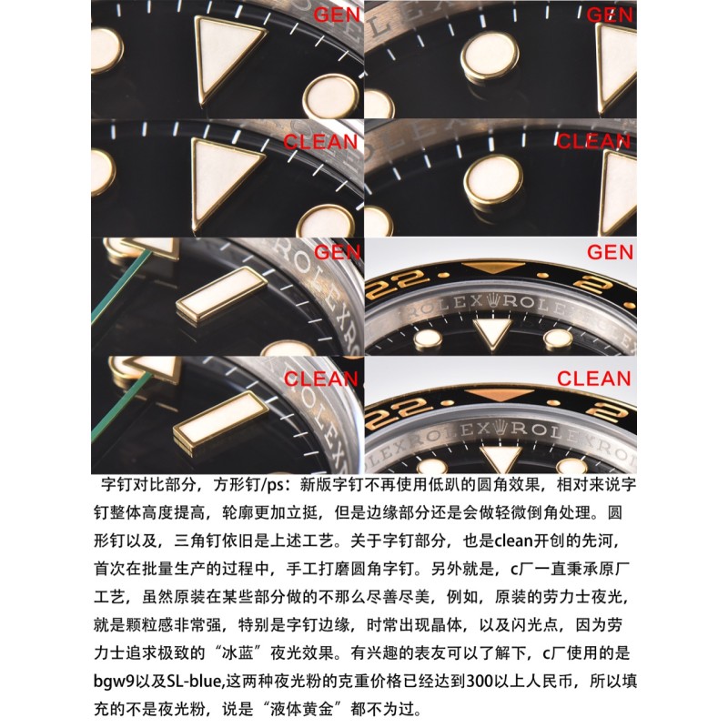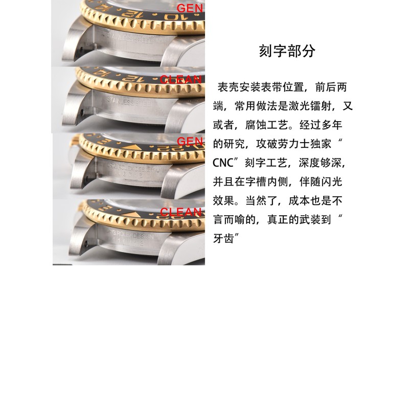 clean厂 c厂 116713格林尼治gmt间金 陶瓷圈字体细节对比,12点位三角部分,顶角,以及底角部分,尖角位置 全部做圆角处理。与原装达到一致。 字体部分,深浅只是一方面,原装工艺为,字体底面全部垂直90度于字 体的直身,做到这种效果,只能模具一体成型,激光打字会出现斜边,以 及底纹粗糙,崩边等一系列问题。 字体深度与原装一致,下沉0.13mm。另外字体边缘圆角打磨处理。 电镀颜色也是经过数字调试,市面上大多为,纯黄金色,真品的略微带一 些红色。观感上来说,会舒服许多。 表壳外观,全部采用904L壳身,完美还原gmt整个壳形,修正gmt转圈手感。皇冠 把头部分也展现出,浮雕皇冠效果。采用和原版一致的3186机芯。 底盖部分,也和原版一致,抛光,拉丝,以及表壳底部拉丝。底盖与表壳的契合程 度,几乎一致。把头与表壳缝隙可以自行对比。内影部分,全系列全部修正字母 “R”的尾巴,微微凸起。如果真的要吹毛求疵,那就是内影部分,底纹没有原版细 腻,受限于,国内激光技术以及设备。 本次C厂推出的是gmt116713间金款,因为第一支原版开模,已经完全损 坏,所以临时又购买一只,细节上会有些许差异。但是在对比的过程中,还 是会以图文的方式进行对比,不会避重就轻,虽然真品版本细节上会有差异 ,但是整体工艺不会有太大偏差,未来的每一款,都会以这种的真假对比的 方式呈现给表友,有则改之,无则加勉。 因为版本差异,但是日历字体会有差异,这个希望理解,c厂除了对于陶瓷 圈口制作在行,在表盘字体印刷,以及日历,也是重中之重。因为页面数量 的限制,就不一一赘述。