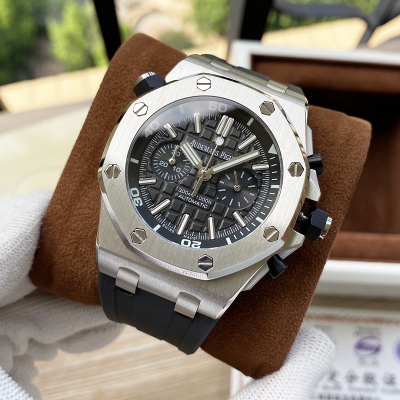 同价380。AP爱彼 皇家橡树系列水果腕表 型号:26703 直径:42mm 超强夜光 1.表壳材质选用的316L精钢,经过CNC一次成型锻造了42mm的表径,表壳在经过拉丝工艺多次打磨抛光后做到了无懈可击,包括螺钉也一致还原 2.表盘字面格纹错落有致,立体感很强。刻度线粗细程度以及长短均与正品保持一致。条钉时标内部填充超强夜光材料。两组小圆盘对称分布,就像两只小眼睛。盘面内有一圈一圈的放大环,细节处理很到位。 3.橡胶表带表面的磨砂质感很强.采用无味不沾灰尘的进口橡胶,只为提高佩戴的舒适感 4.前后玻璃都采用蓝宝石水晶镜面玻璃,镜面通透性也很强!做到了外观和正品的极其相似,走时精准稳定!!!